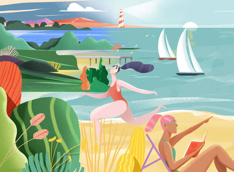 All the plants are so nicely executed. Also loving the female running and how the waves are drawn.