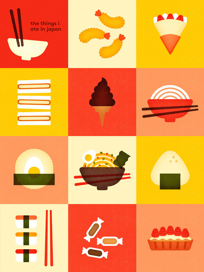 A beautiful simplification of what you can eat in Japan. Bright colors used, but still refined enough.