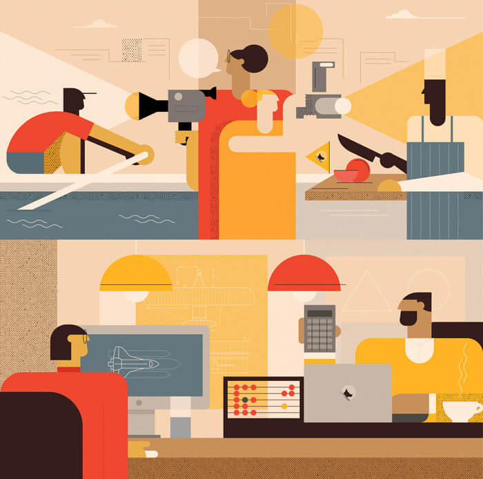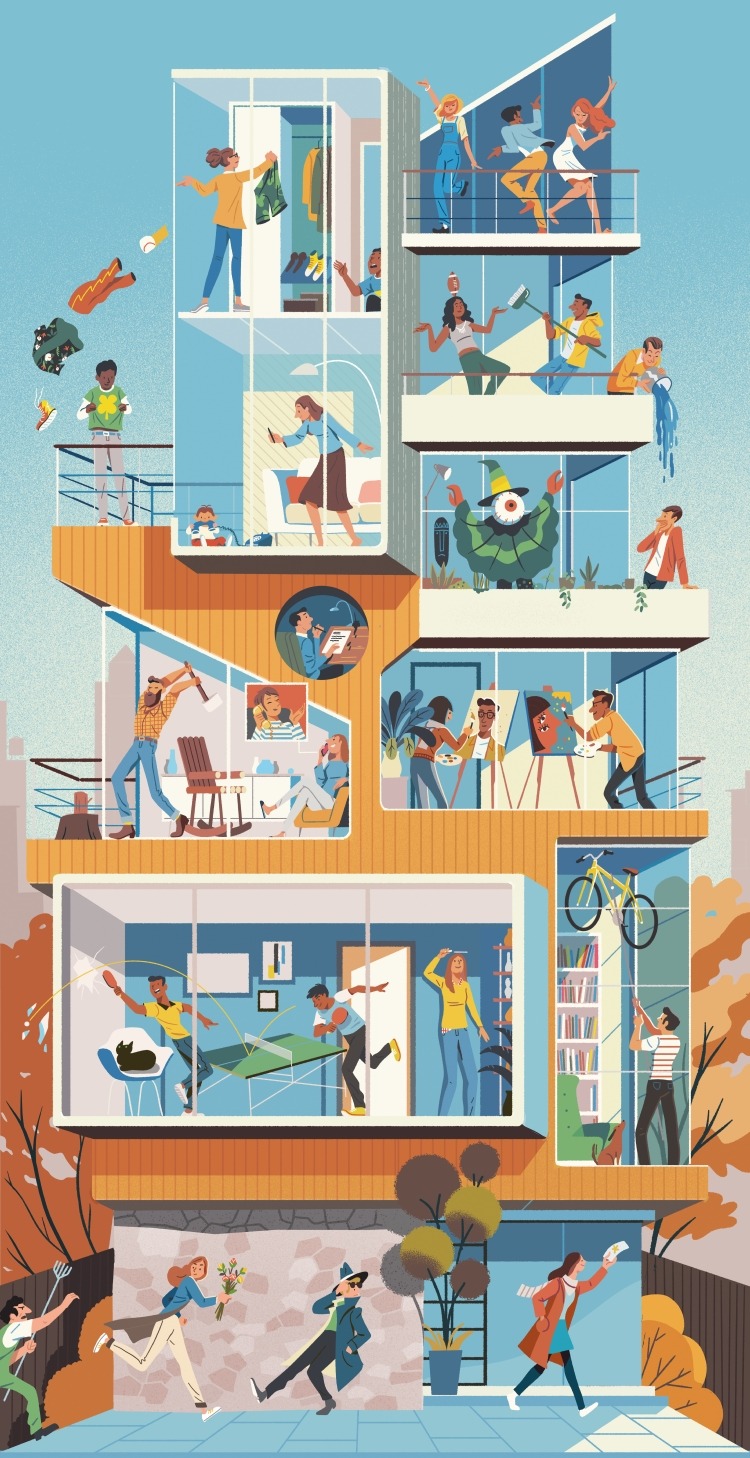 A super-duper color palette to begin with and loads to discover in this editorial illustration for the Wall Street Journal. With all this action going on, you won’t be able to stop looking at it.
