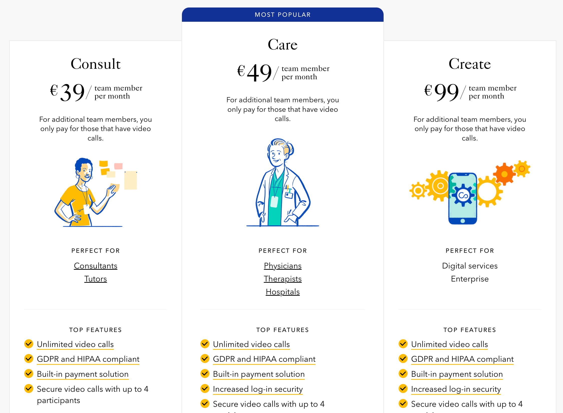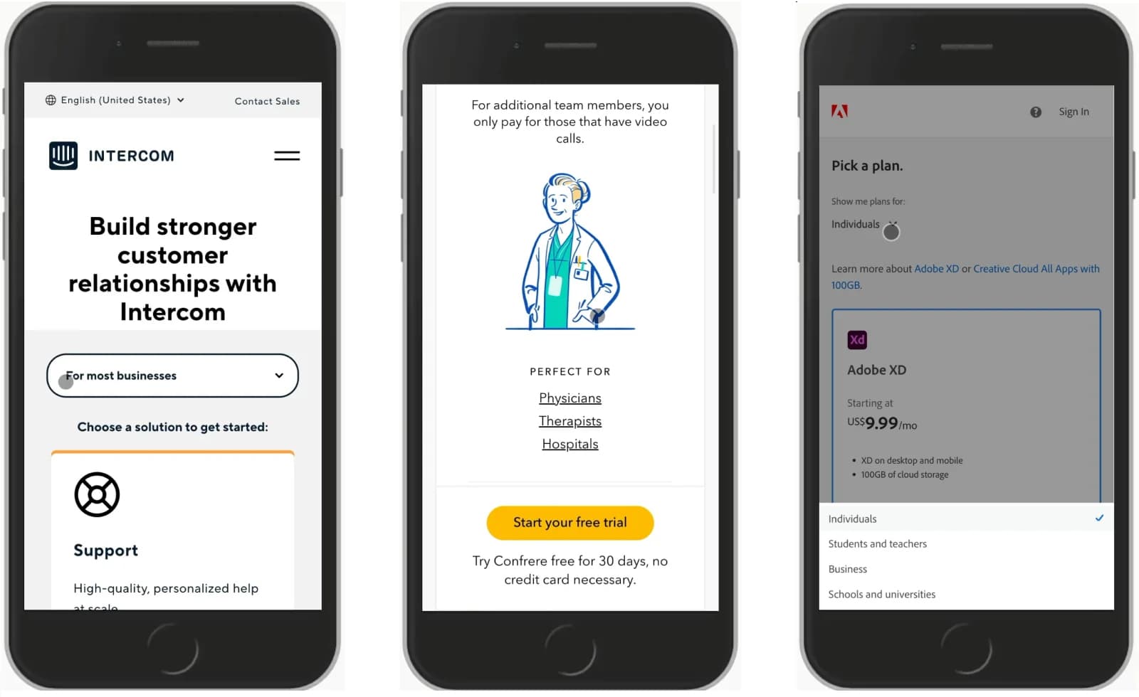 Intercom allows customers to select between a plan intended for very small businesses or regular businesses. Confrere explains the roles that a plan is designed for — consultants, physicians, therapists, or hospitals. Instead of focusing on generic plan titles, Adobe XD highlights plans for individuals, students, businesses, and schools.