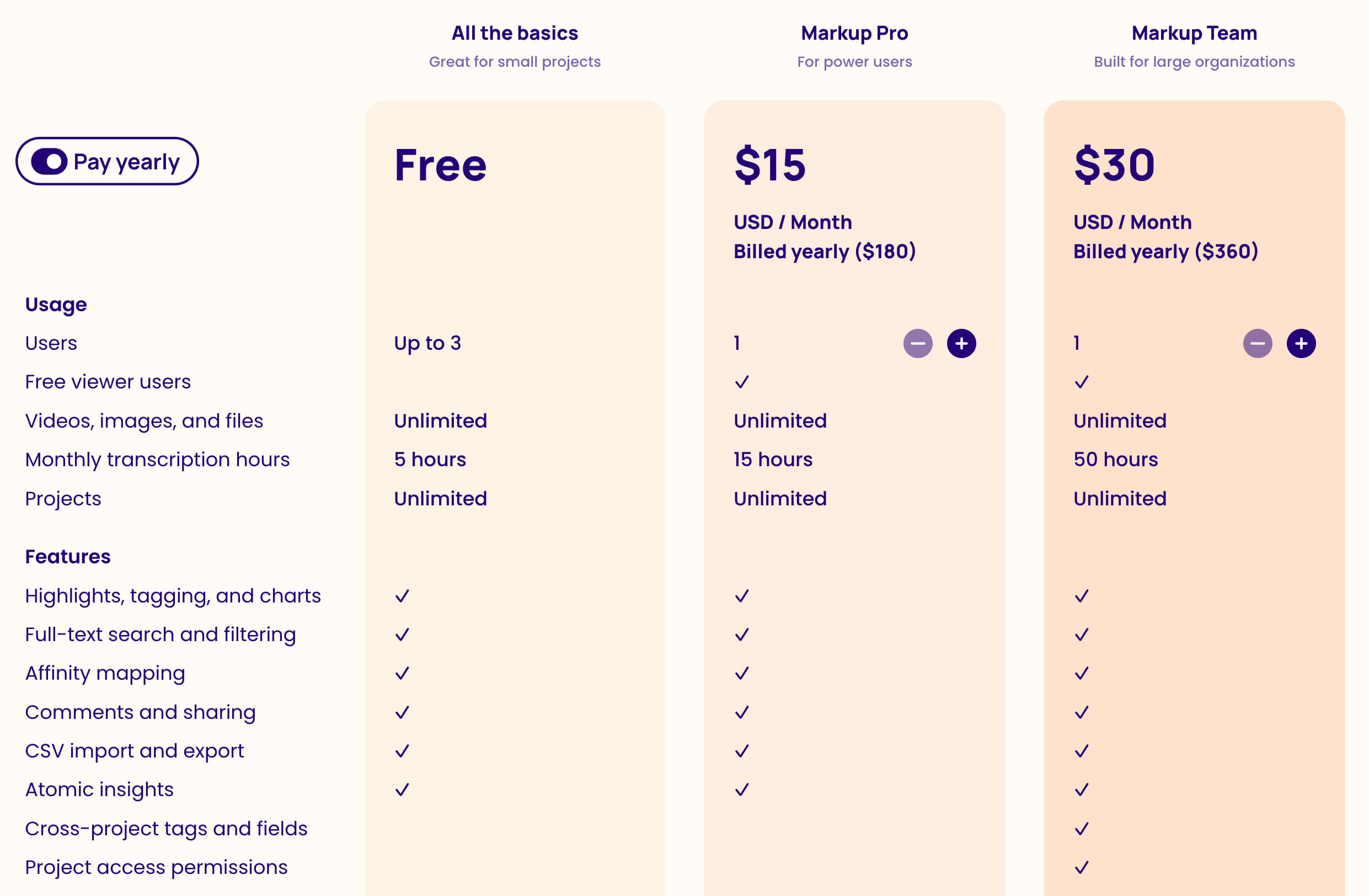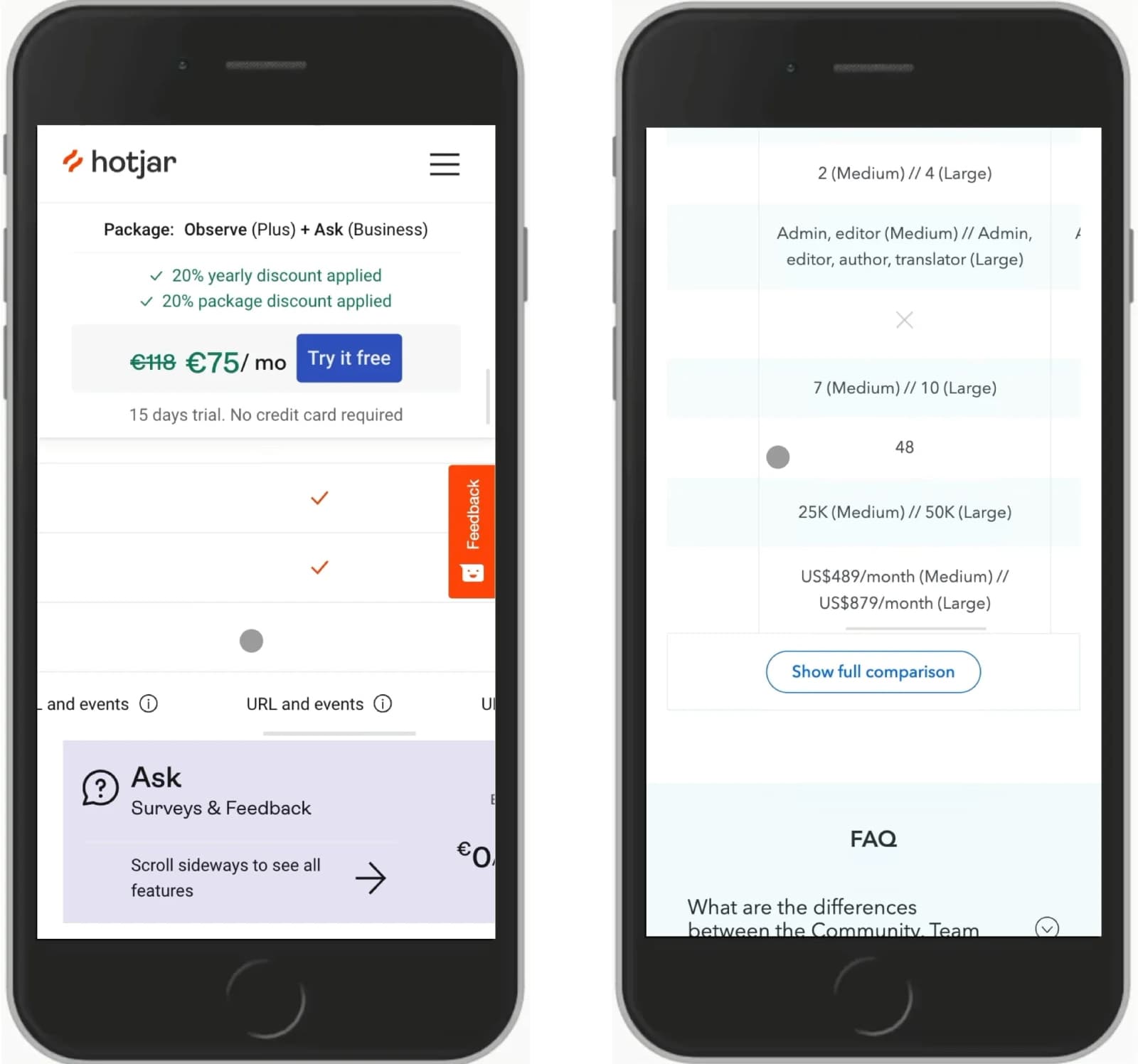 Comparing within a table with horizontal scroll is rarely a fun experience. On Contentful and on Hotjar, neither the attributes nor the corresponding pricing plan are obvious once you dive deep into the comparison matrix. Surely customers can scroll horizontally, yet this adds friction to the comparison.