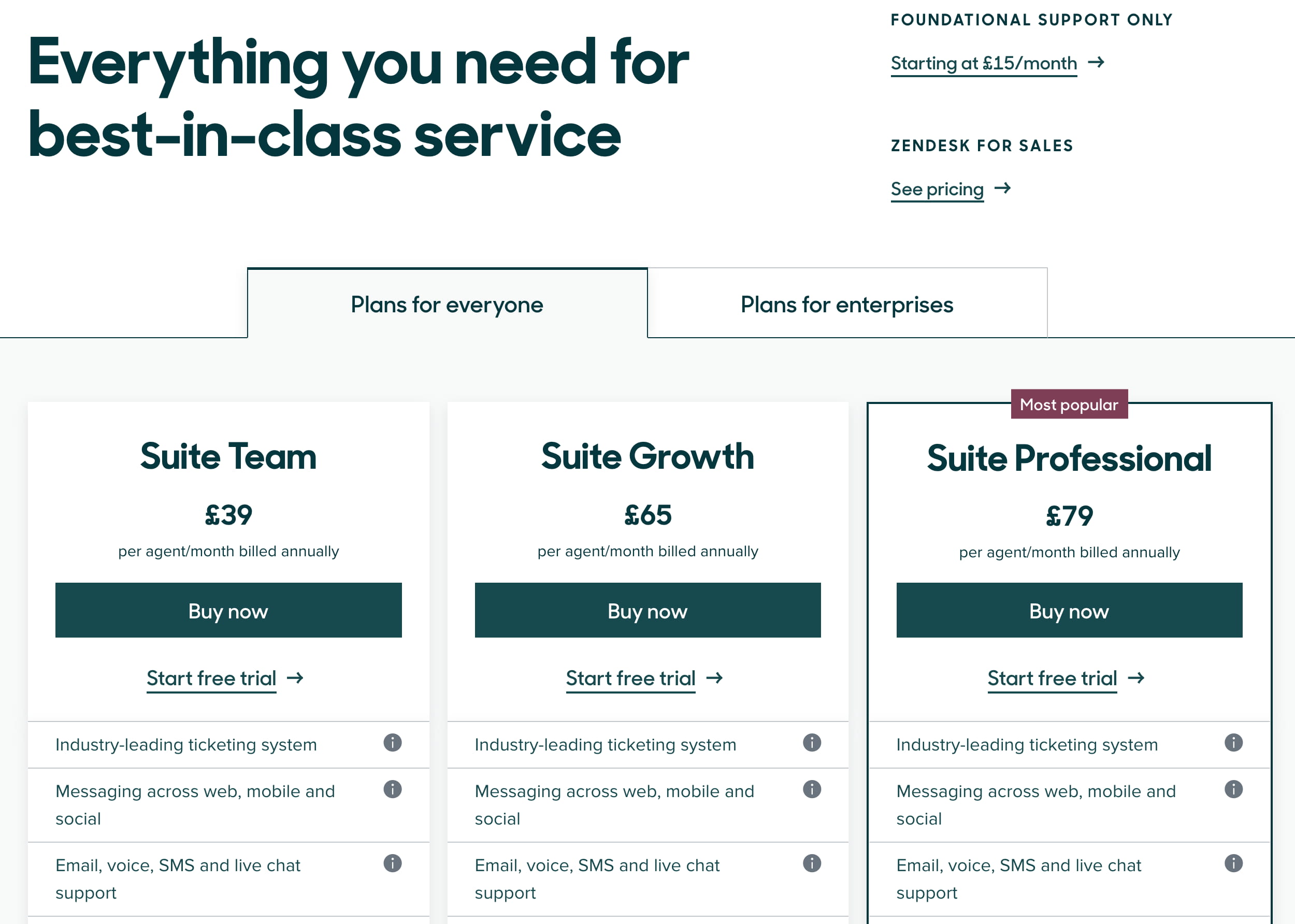 Zendesk groups their plans into tabs. Not all plans are displayed at all times, and users are encouraged to specify what is it they are after first: individual plans or enterprise plans. There is also a dedicated comparison view to compare all 4 plans at once.