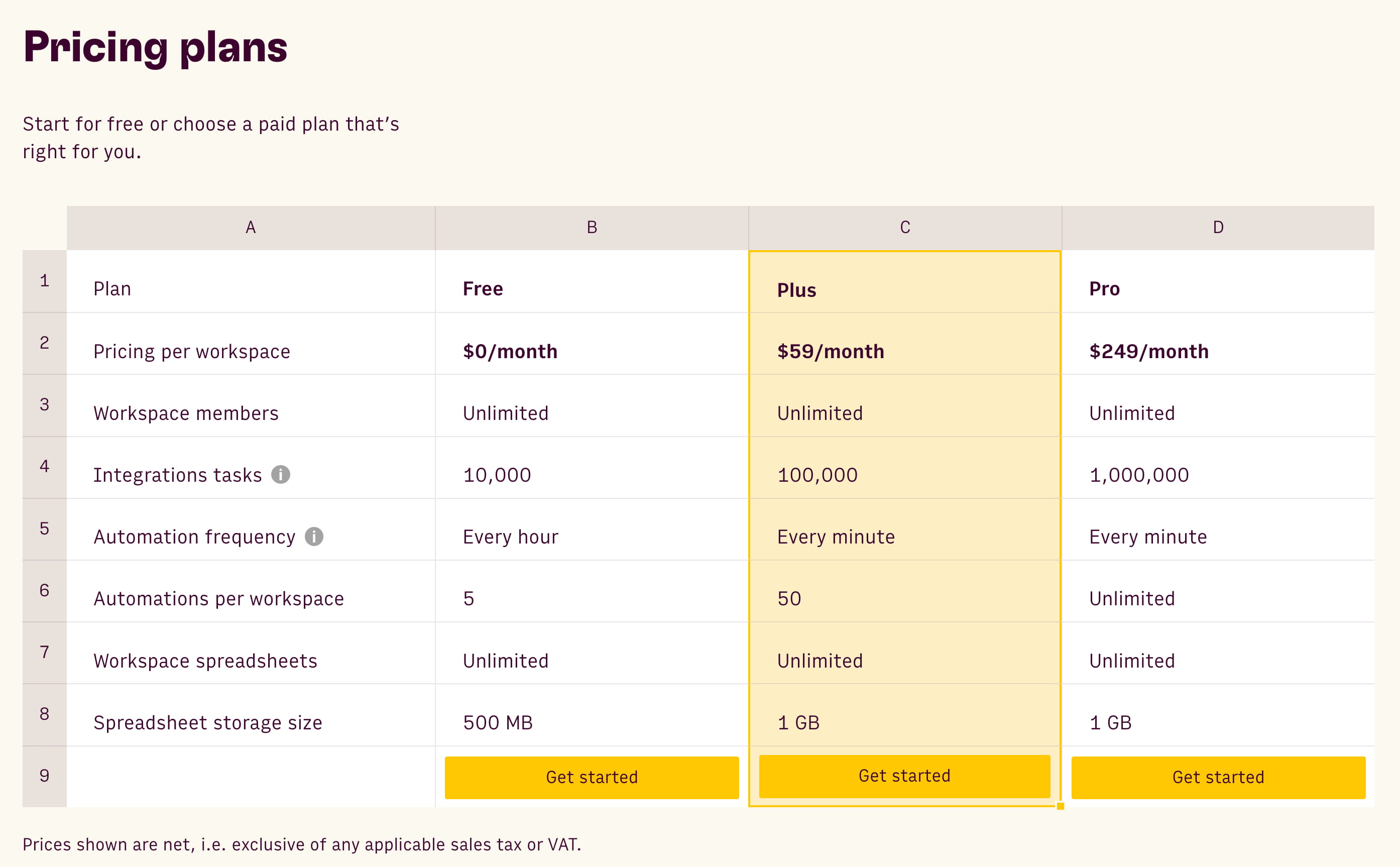 On Rows, pricing plans are beautifully presented within a spreadsheet, making it feel like a regular sheet that customers might use on their own when making their calculations. On mobile, each column becomes a standalone card, appearing one under another.