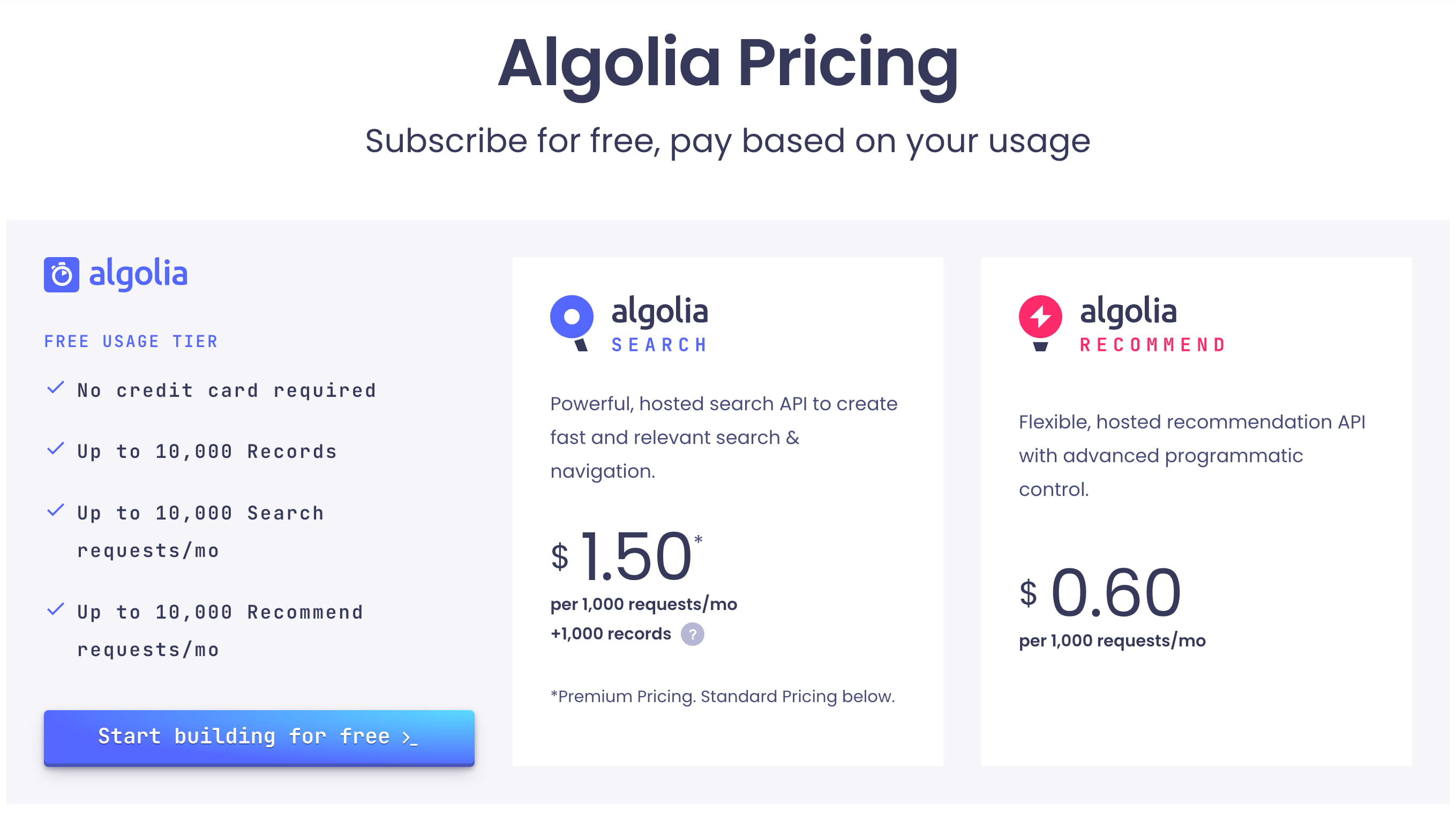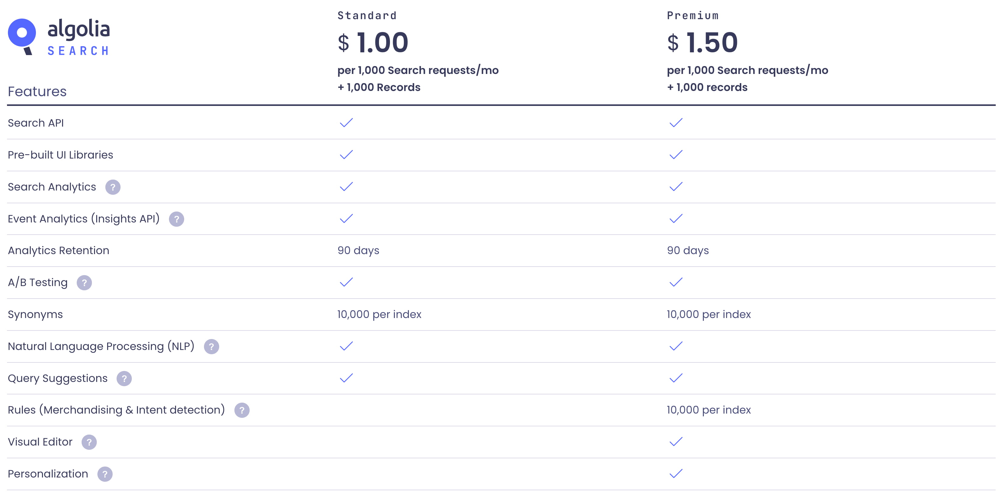 Algolia follows a similar approach. Rather than highlighting every individual feature at the top, the feature matrix is placed further down the page, with the enterprise option only visible closer to the footer of the page. There are also add-ons, further plans, and FAQ featured there.