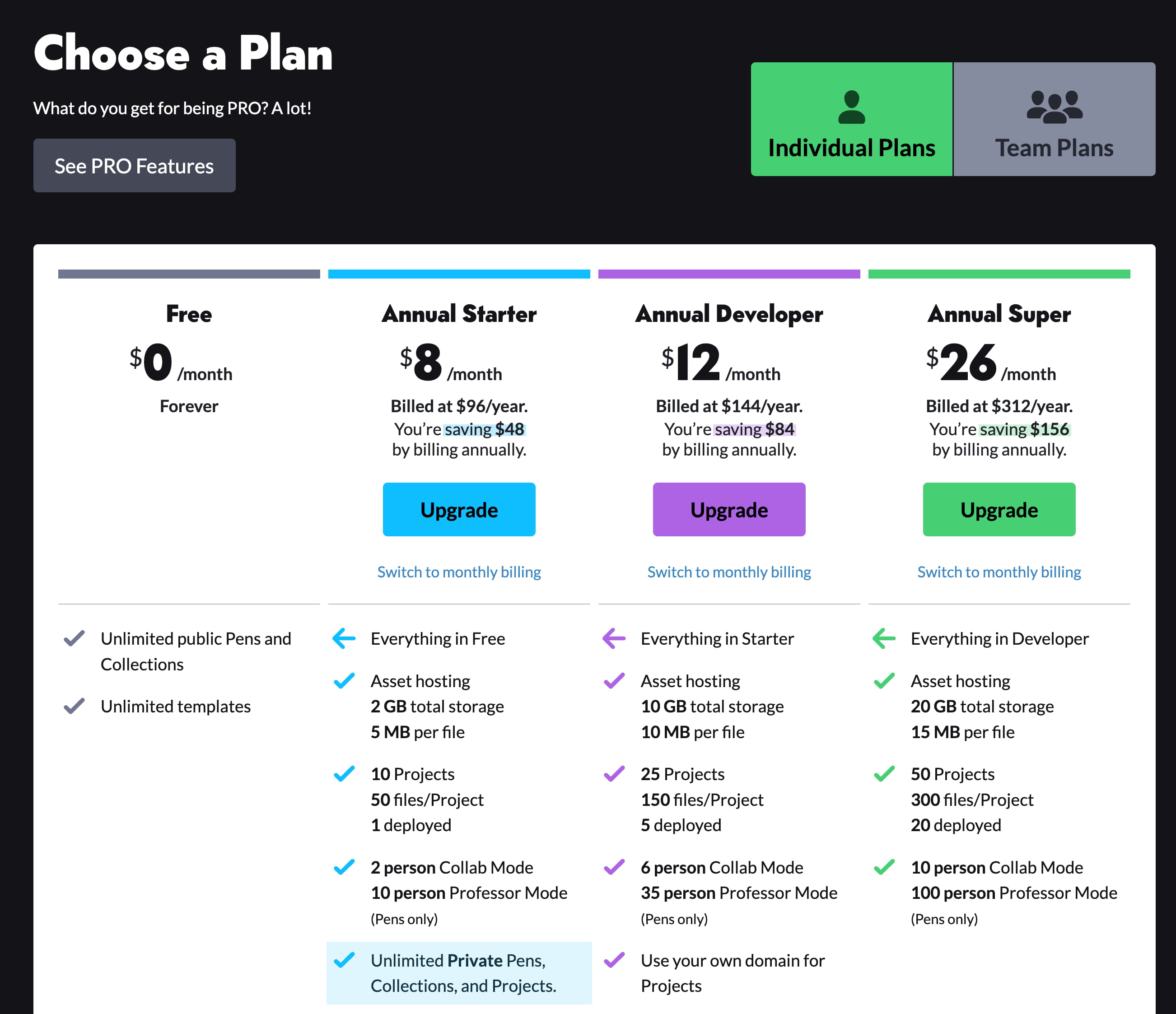 Now, this doesn’t sound like a particularly challenging task at first, does it? After all, we’ve seen something quite similar already with our good ol’ feature comparison tables. In fact, many design patterns discussed there are very much applicable to pricing plans as well, so please take a look there first and come back afterward.