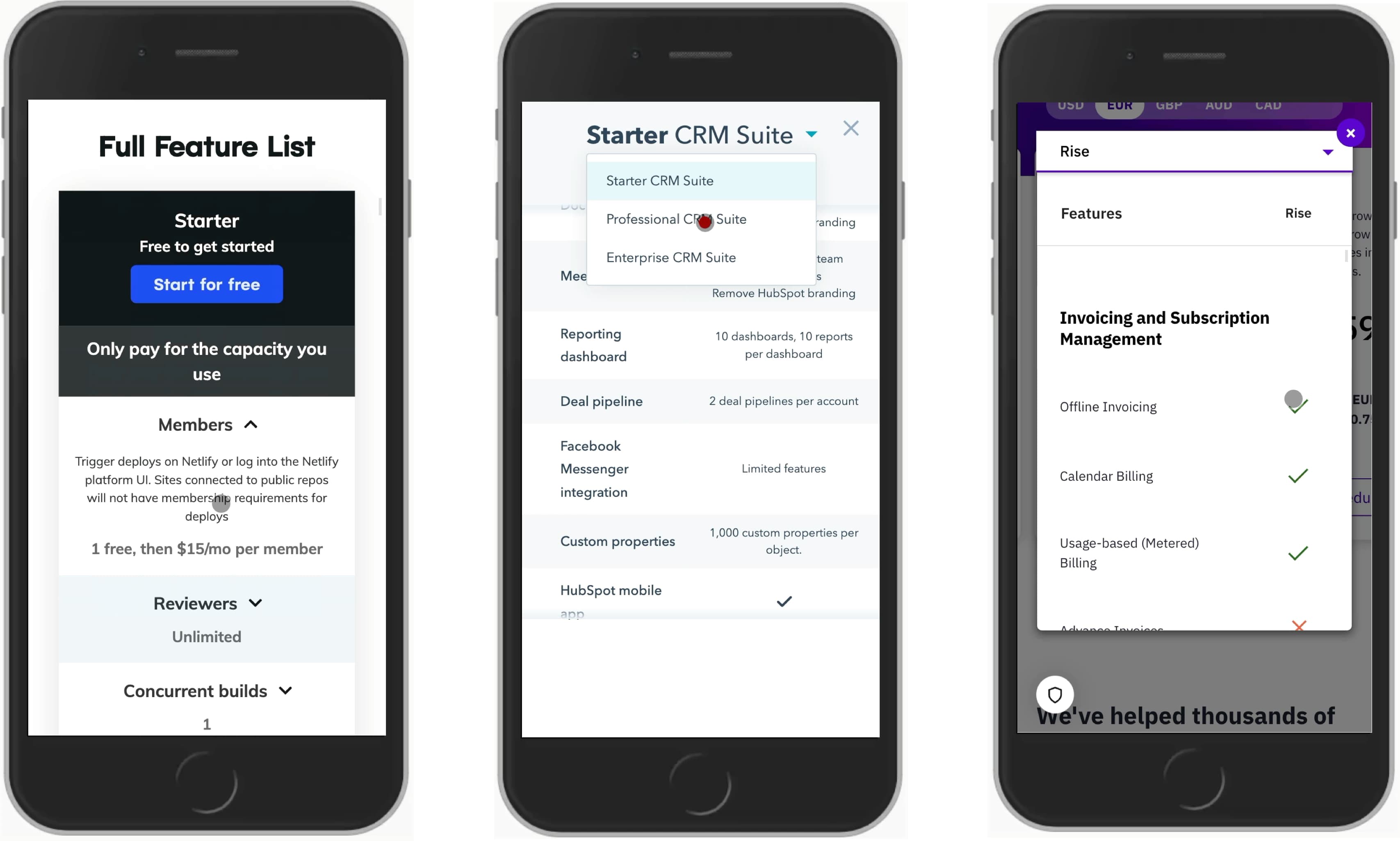 On Netlify, as you scroll down the page, all features are repeated multiple times, with a new section appearing as a sticky bar on the top, and hence indicating what the current plan is. On Hubspot and Chargebee, a modal view with a drop-down is used to jump between the plans. That’s quite a bit slower compared to tabs and usually not really necessary. It’s a good idea to see them here as the method of last resort.