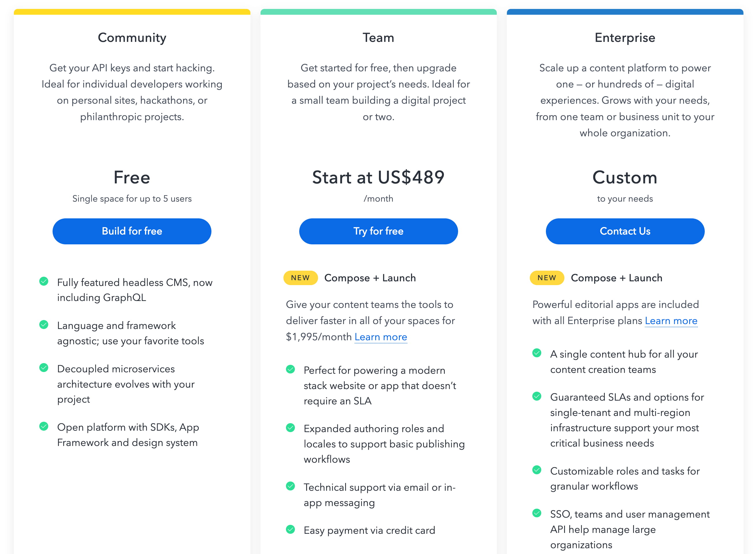 On Contentful, the pricing page doesn’t set focus on a lengthy feature comparison table; instead, the three main plans are highlighted at the top of the page, with just a few key distinguished features. The fully-fledged feature list is also available, but further down the page, rather than being the front and center of the experience. That’s simpler and better.
