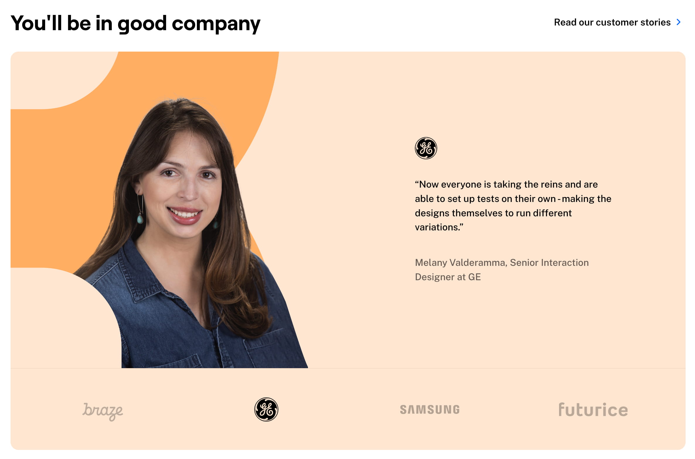 Maze explains how a company might be a good fit for a plan by using testimonials and short case studies with photos by various brands explaining how the plan helped them.