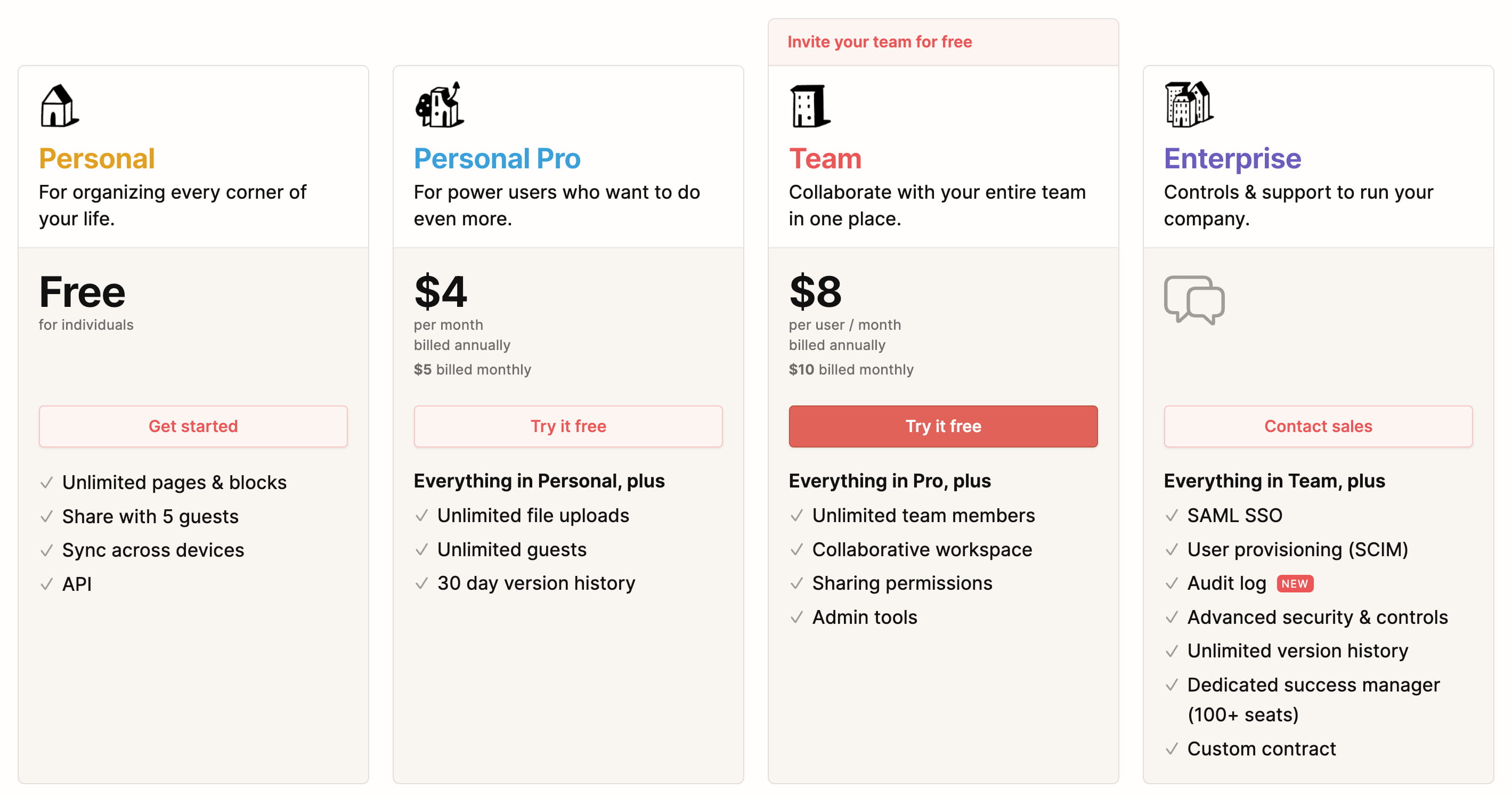 Notion pricing page is a great example of it, albeit a little bit different. All pricing plans are billed annually by default, with an option to switch to a monthly payment when signing up. Each plan explains the role for which it’s been created as long as the features of that plan. As we move from left to right, we keep adding more features.
