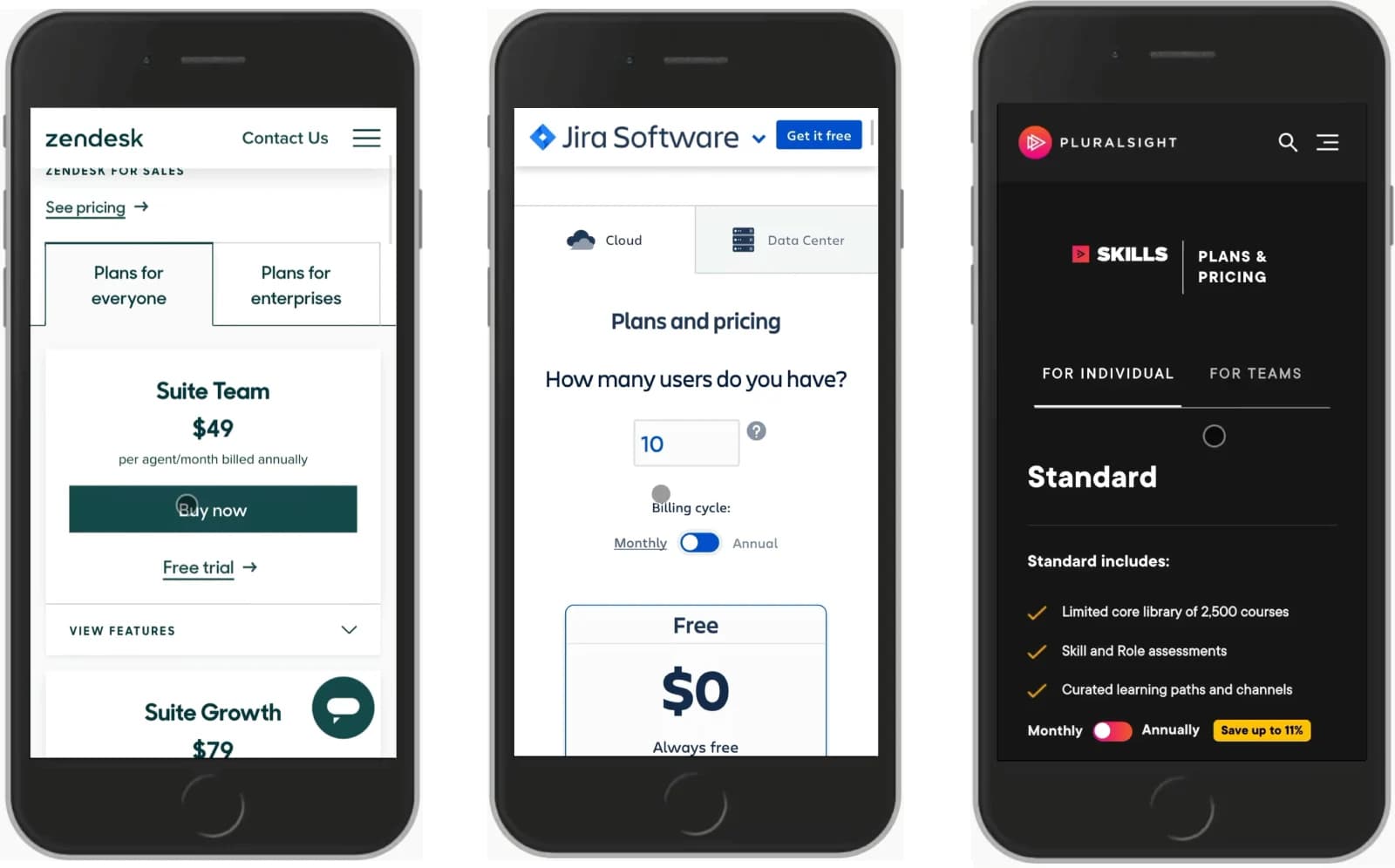 If you need to locate the free plan or the enterprise plan, where would you expect it to be on the pricing page? Indeed, the free plan is likely to be on the left, and the enterprise plan either in a separate tab or on the right. Indeed, in left-to-right interfaces, we intuitively assume that there is a sort of progression from simple basic plans to expensive enterprise plans from left to right.