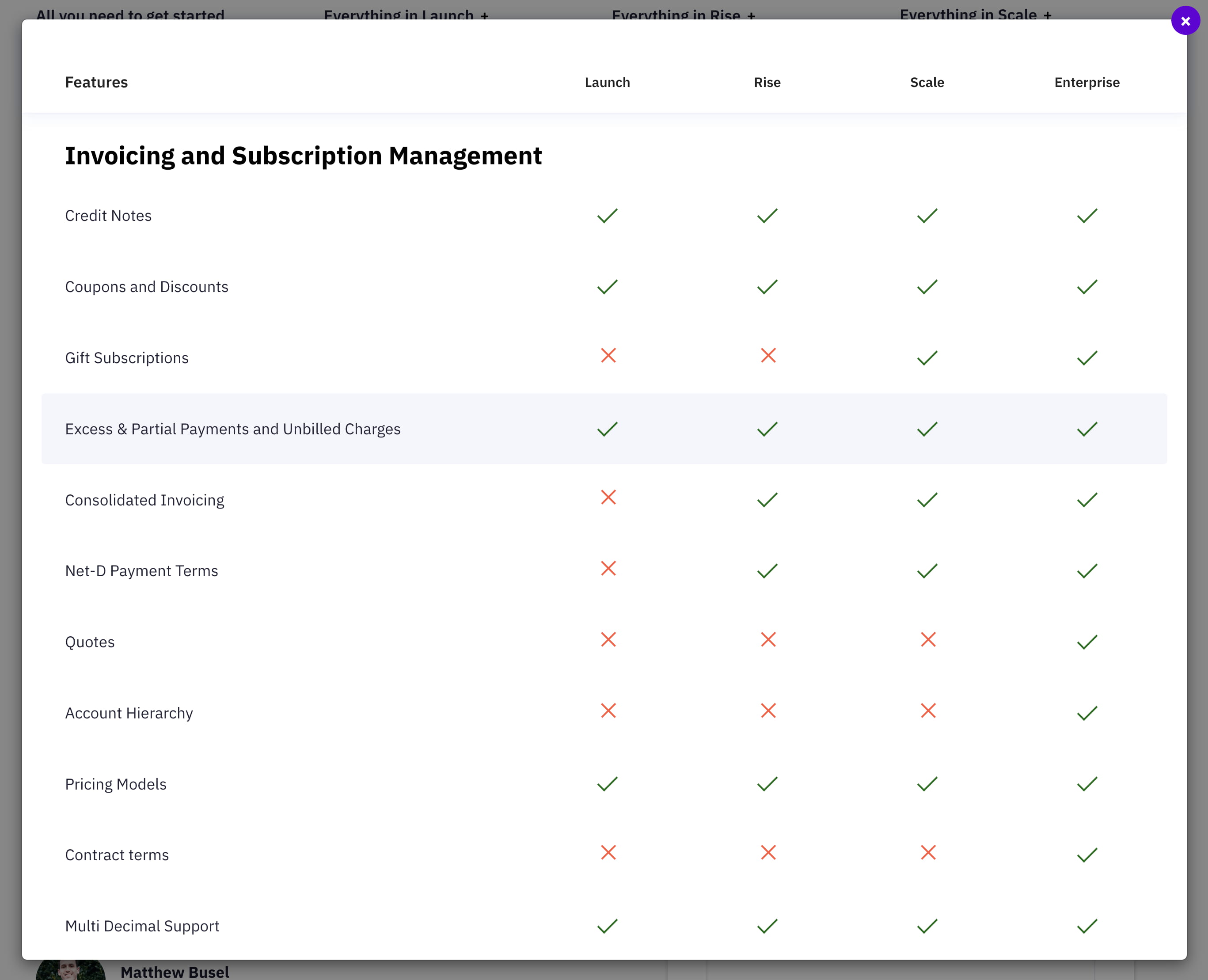Chargebee does highlight plenty of features of each plan, but a full comparison table appears only if the user actually chooses to see how the plans compare. On click, a modal window opens with all options lined out in a table.