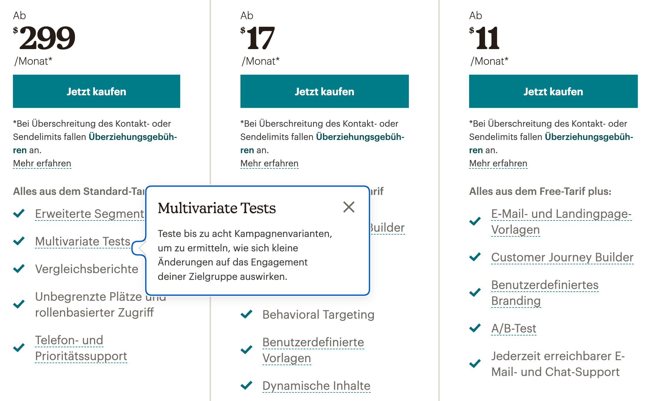 In general, it’s worth testing just how necessary a large list of all features is, and whether a pricing page design would work better by showing only a handful of distinguishable key features instead. We could start with a design containing just a few items in the list, and add more once we know that the differences between the plans aren’t clear enough for our prspect customers.