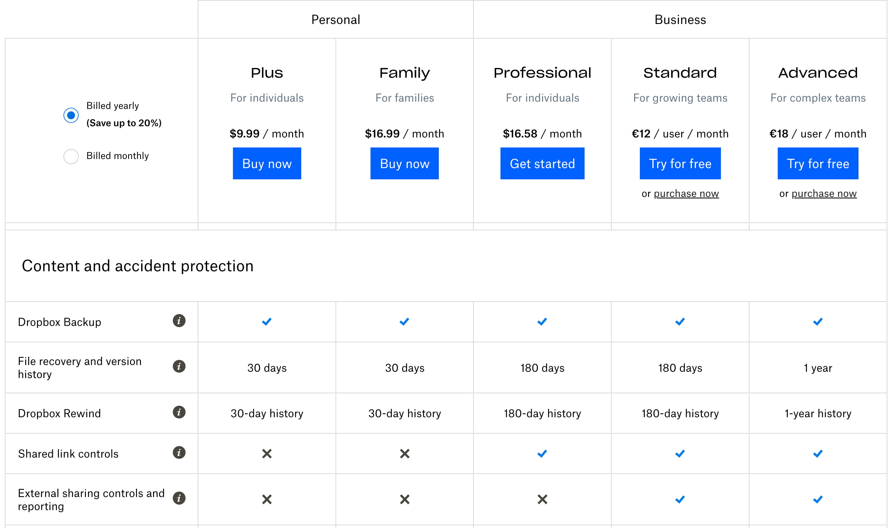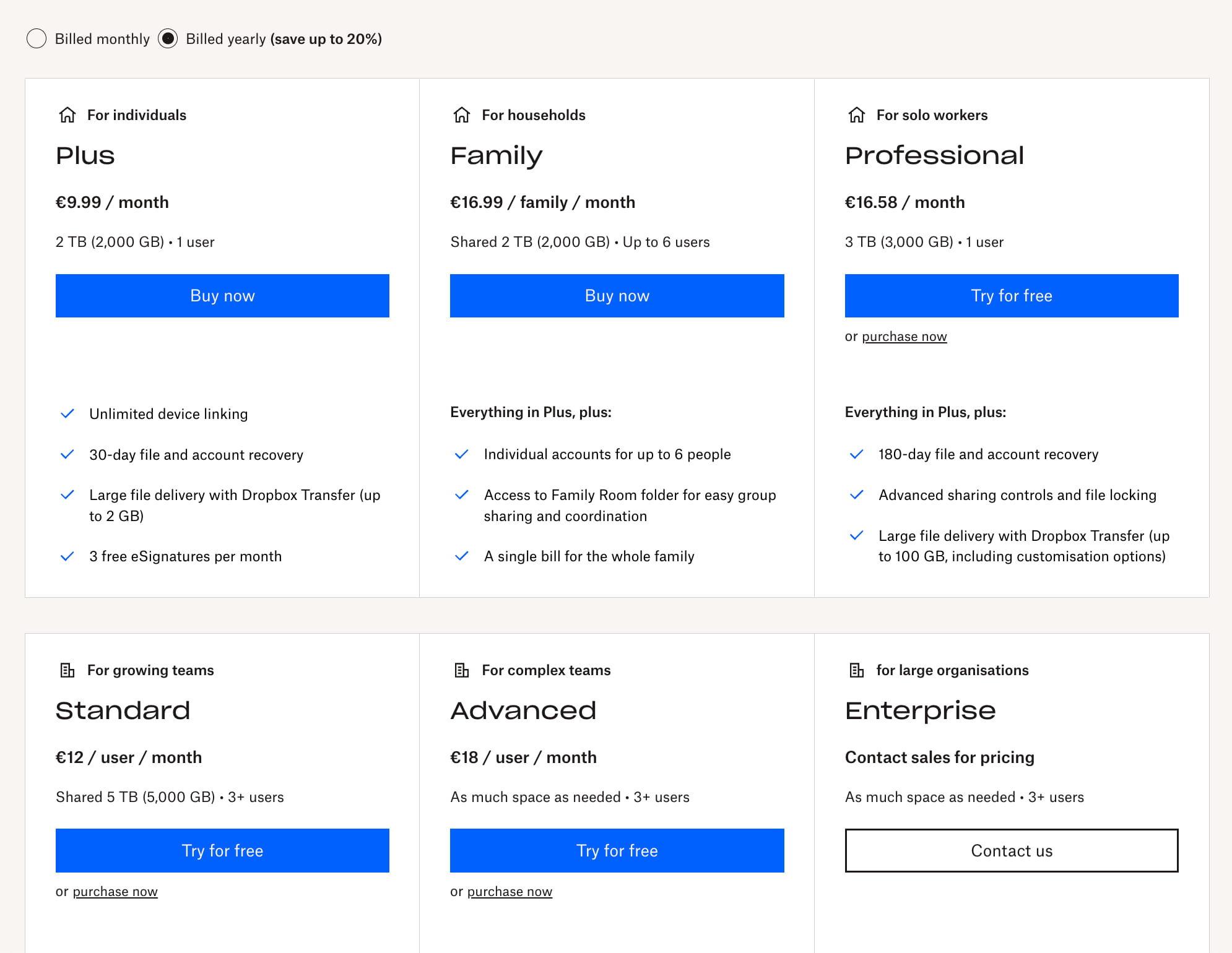 Sometimes all plans wouldn’t fit comfortably in one single row. For their six pricing plans, Dropbox wraps them all onto two separate rows. It definitely is a better idea than showing all plans in a condensed 6-column view. Rather than requiring a checkout, customers can also try out some plans for free.
