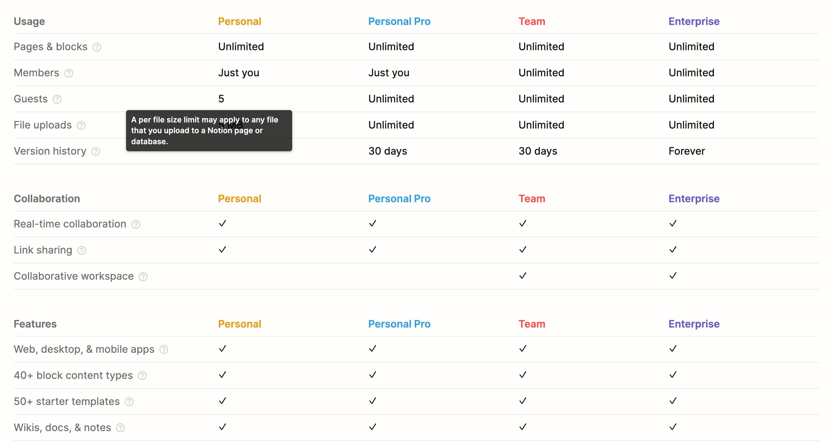 On Notion, hints explaining each feature are displayed when a user chooses to hover over the question mark icon. Unfortunately, they aren’t focusable and hence not keyboard-accessible. On mobile, the feature comparison table disappears altogether.