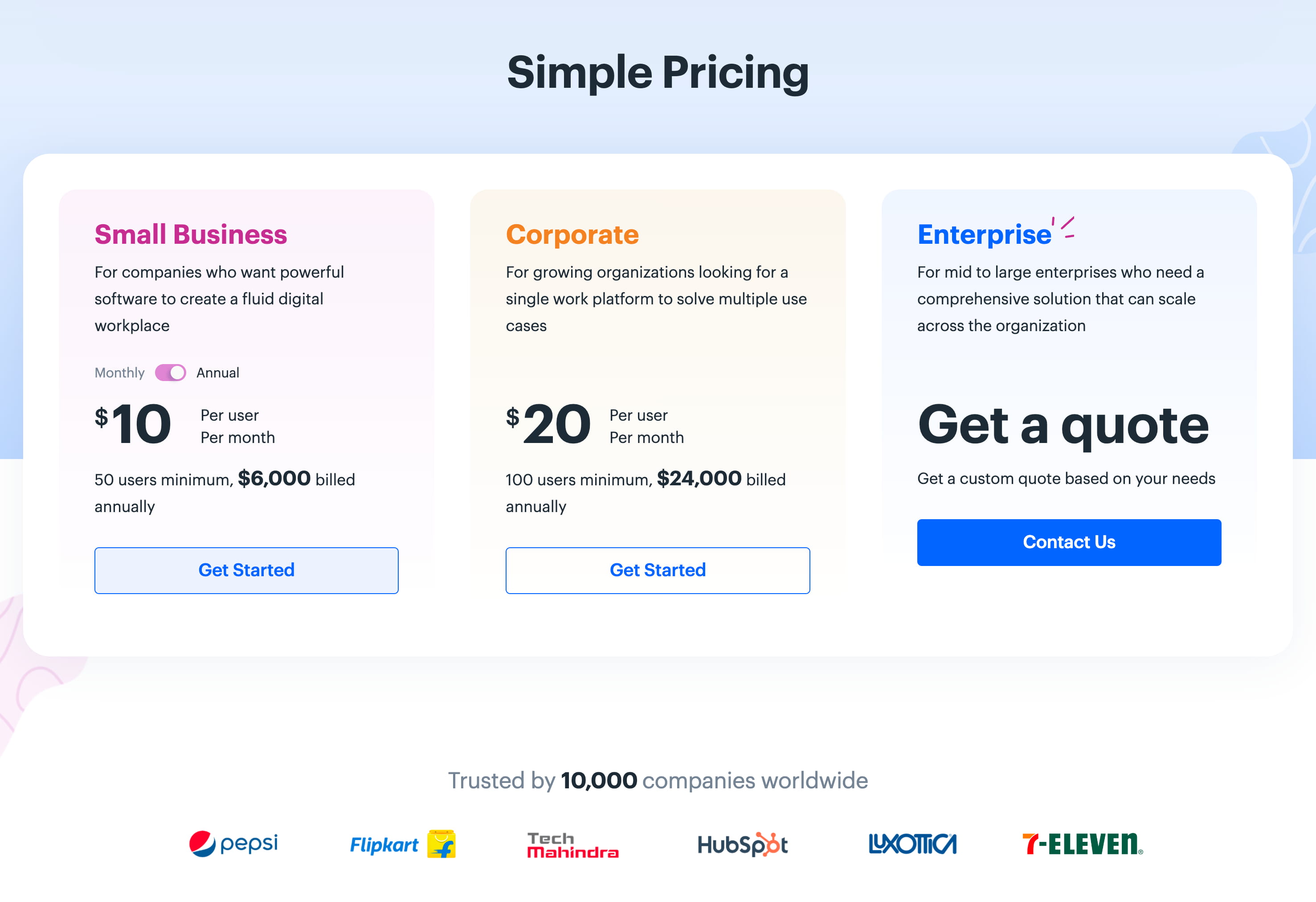 Kissflow doesn’t include a feature comparison matrix; nor are there any lengthy essays about available features or existing customers. Just three simple options with calls to action. While it might be enough for some companies, it might not be enough for others.