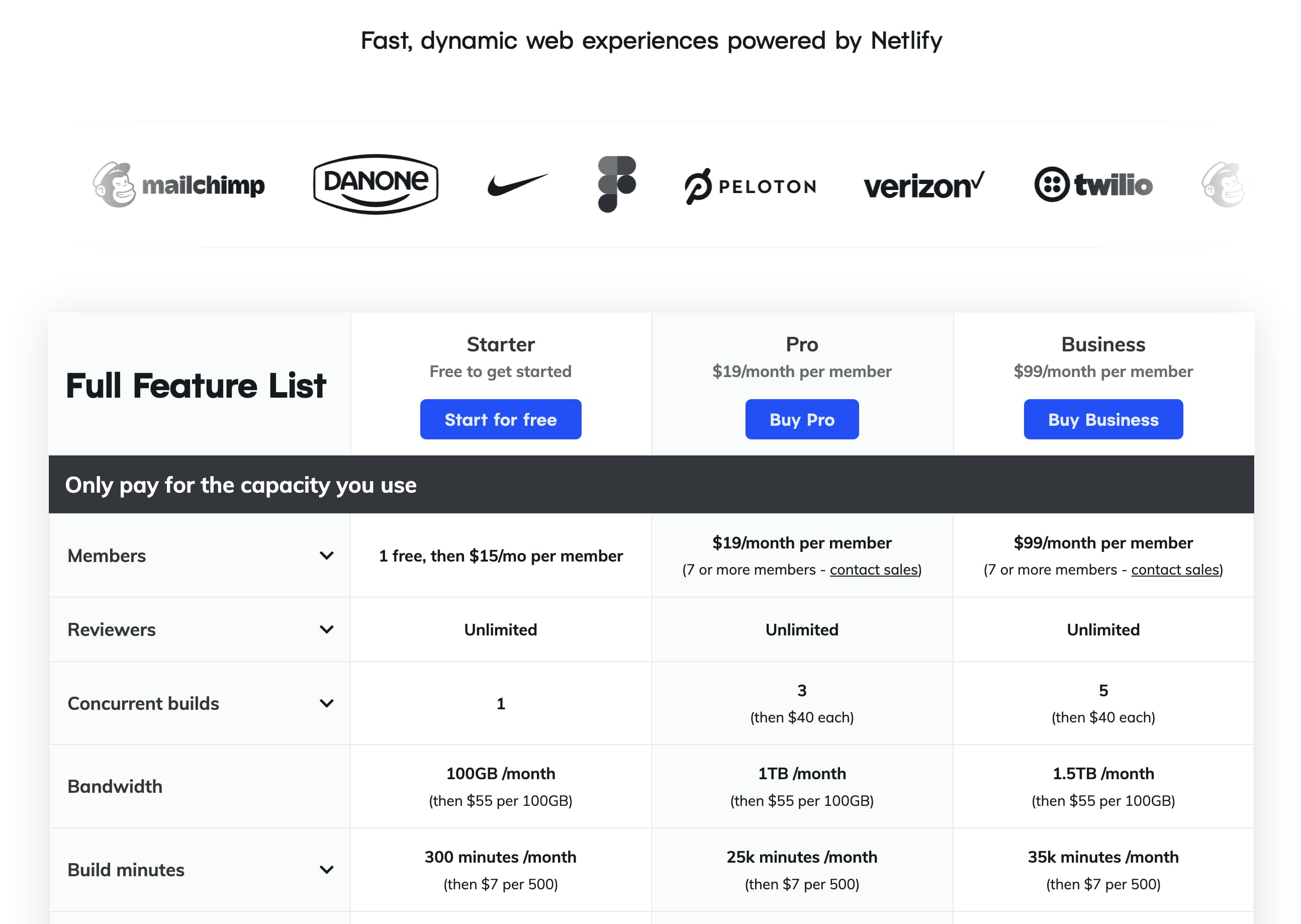 On Podia and Netlify, every feature is explained in a separate accordion. Frankly, not every feature has to be explained, and one issue might be that some customers might assume that + represents an option to add an add-on to the current price, which it isn’t. Perhaps having a chevron instead would be a bit more bulletproof.