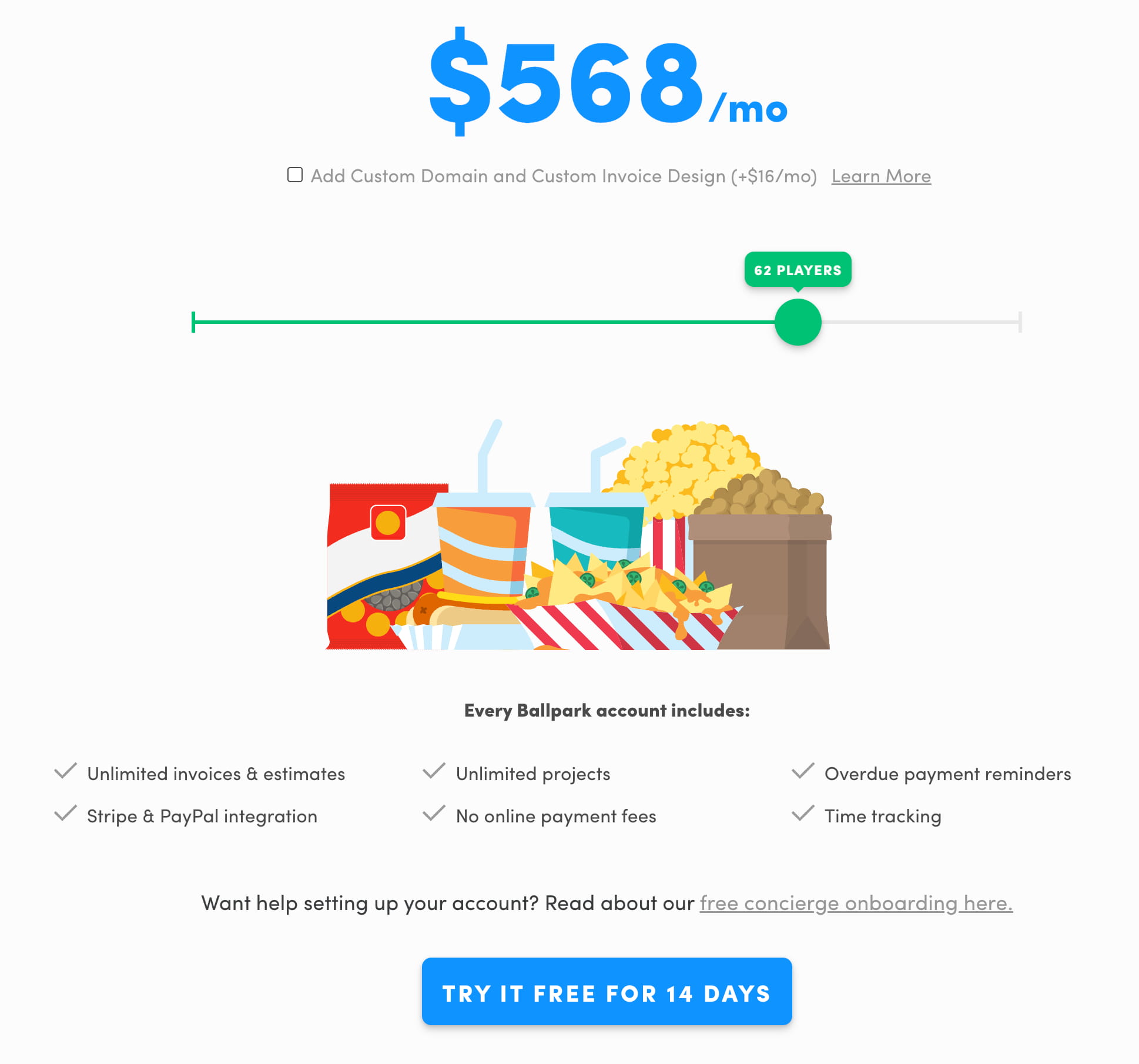 Ballpark visualizes the pricing plan by building up a ballpark bundle with a slider. It also explains all features that go along with the plan, and there is an option to use a free concierge onboarding as well.