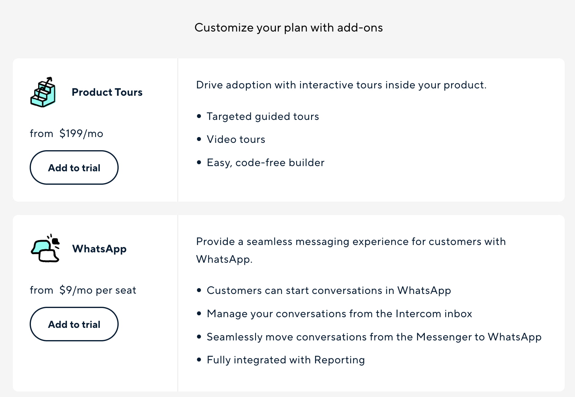 Intercom focuses on add-ons and extras that can be added to the basic plan. This gives users an overview of the final price early on.