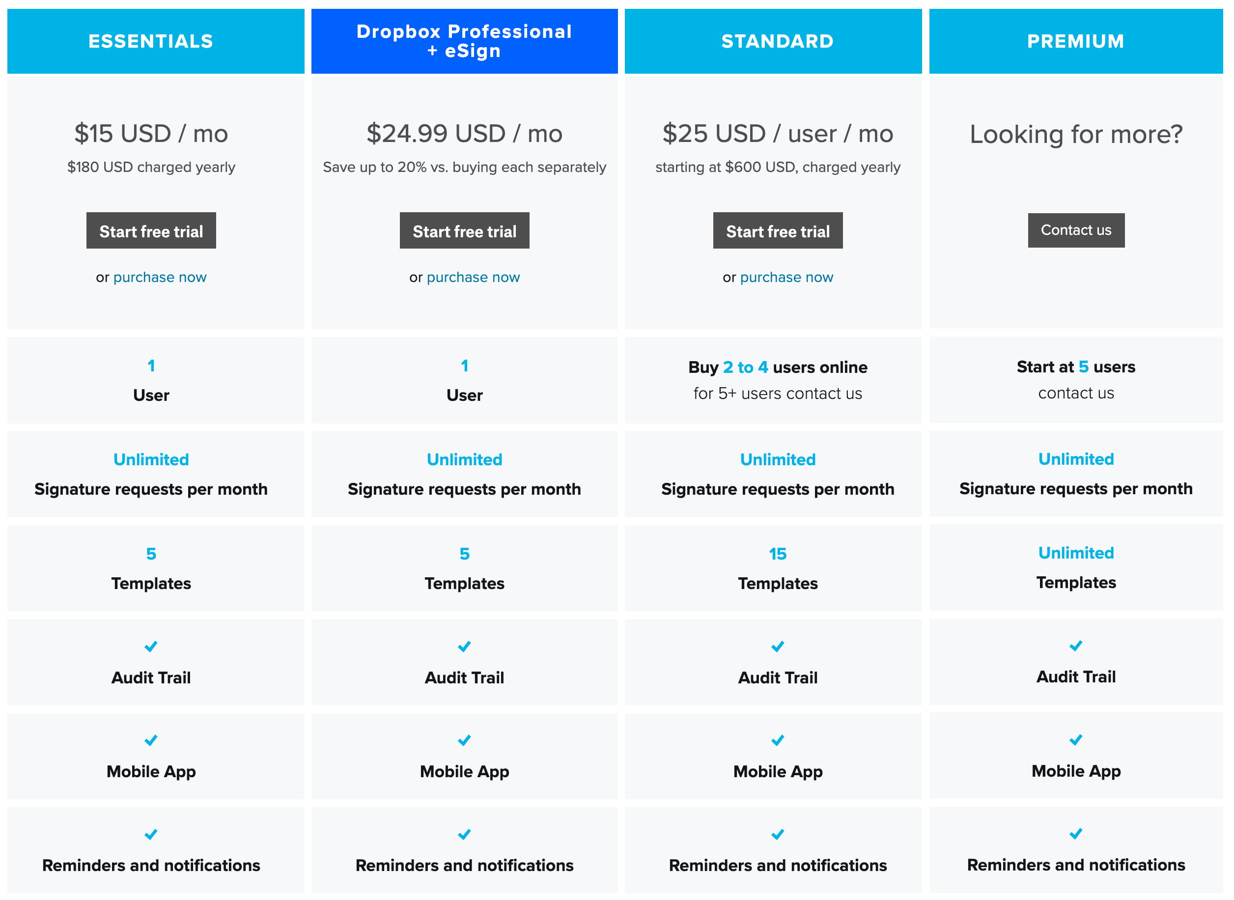 For comparison, HelloSign’s pricing page appears to be quite complicated, mostly due to plenty of cells all appearing as standalone blocks. Every attribute is repeated multiple times, making the pricing plans slightly more difficult to scan. Showing attributes separately in one column with checkmarks in each column might be a good idea here.