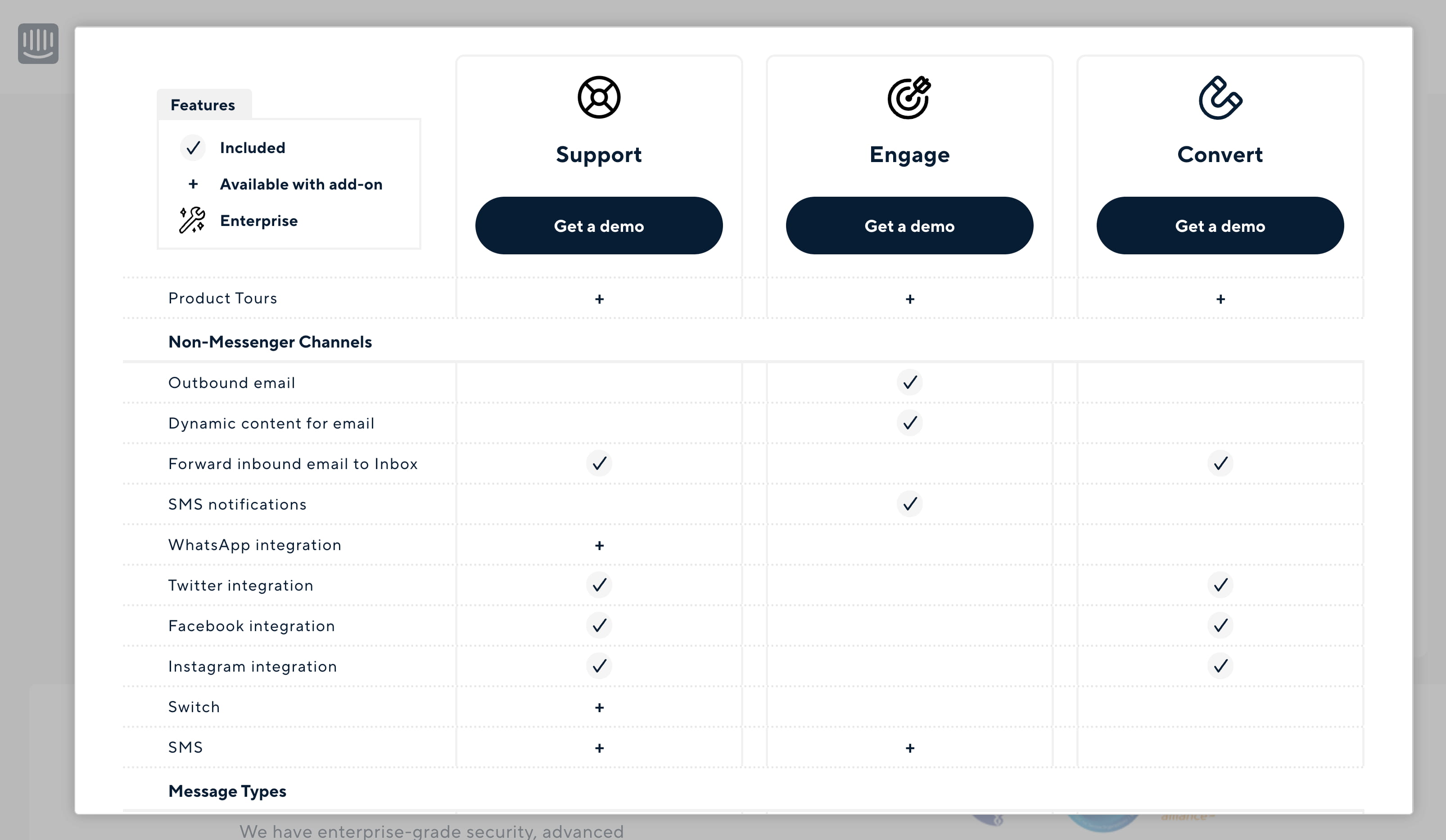 Intercom highlights all features in a modal window, with the pricing plans floating as users scroll the table and explore their options.