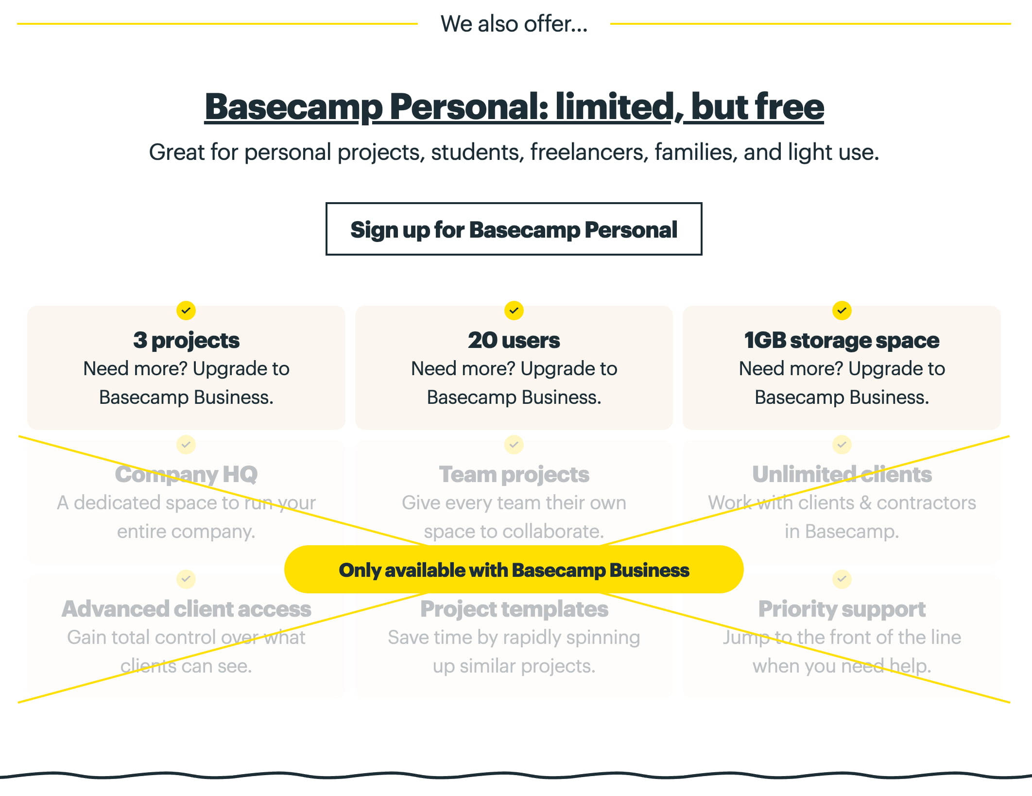 Basecamp takes a similar approach by highlighting the main “business” plan but also explaining how the personal plan is different: it just doesn’t have some features that the main plan does. We can illustrate it by literally crossing out the features that are missing in that plan.