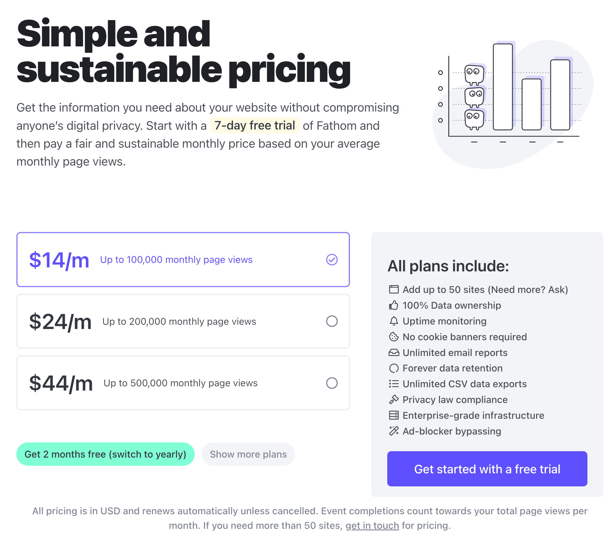 Fathom Analytics changes the pricing based on a single attribute: the number of monthly page views. Rather than displaying features for each plan, all features are listed separately in the right column, while the pricing options are displayed on the left. Also, notice the call to action “Get started with a free trial,” and an option to get 2 months free by switching to the yearly payment. Simple.