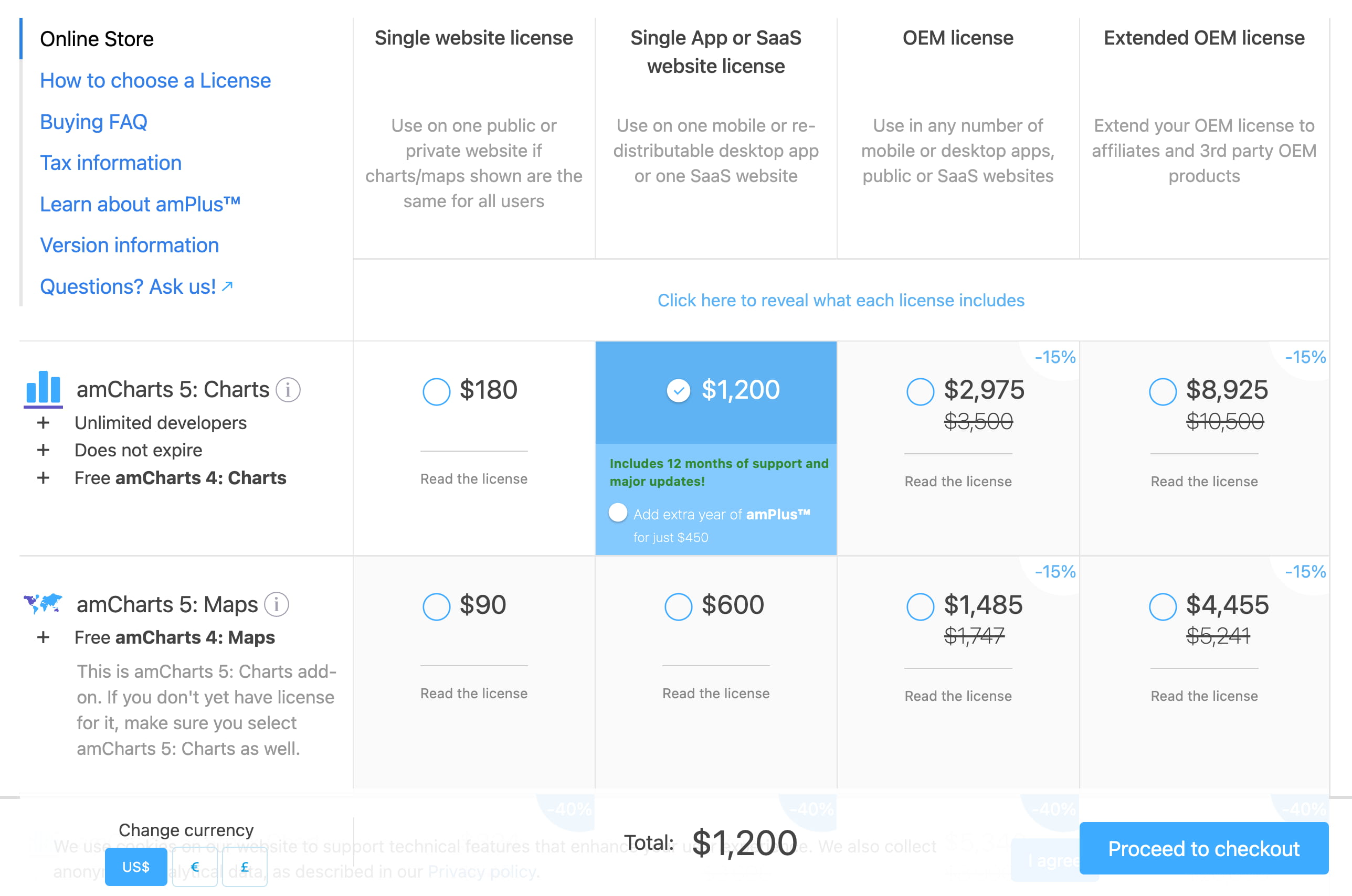 Sometimes pricing plans are slightly more nuanced and complicated. amCharts features 4 different kinds of licenses available for every individual product. The pricing is displayed in a matrix, similar to the pattern we often see when booking flights, trains, or cinema tickets. Overall, we see a similar amount of options here, but they are displayed right away, while in the examples above, extended pricing options are hidden and revealed only once a user contacts customer support.