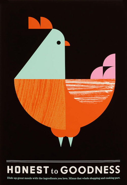 Nice artwork for The Kitchen, the prepared-foods division of Whole Foods Market. The illustration is part of a visual identity system that spanned everything from identity and packaging to custom illustration and signage. I love the simple shades and color palette. The black background works really well. See it all.