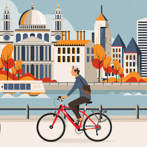 A series of illustrations created for Emu Electric Bikes and their advertising campaign, showing the bikes in the various environments of the countryside, suburbia and the city. The red of the bike draws the attention. The trees and other ‘green’ have an interesting more organic shape and contrast well with the other shapes. They are in sync with the guy on the bike, and the lines of his bag.