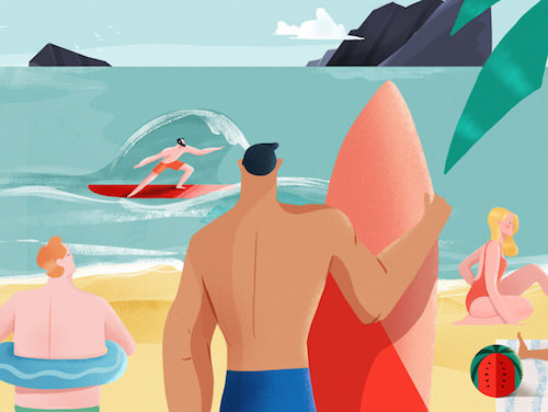 Bold geometric shapes, bright colors, and voluptuous vacationing characters are giving this illustration a whimsical and sultry personality.