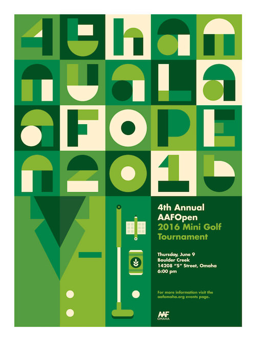 Poster for the 4th Annual AAFOpen Mini Golf Tournament. Very well executed as you can see the courses in the letters and the green jacket that the winner takes home.