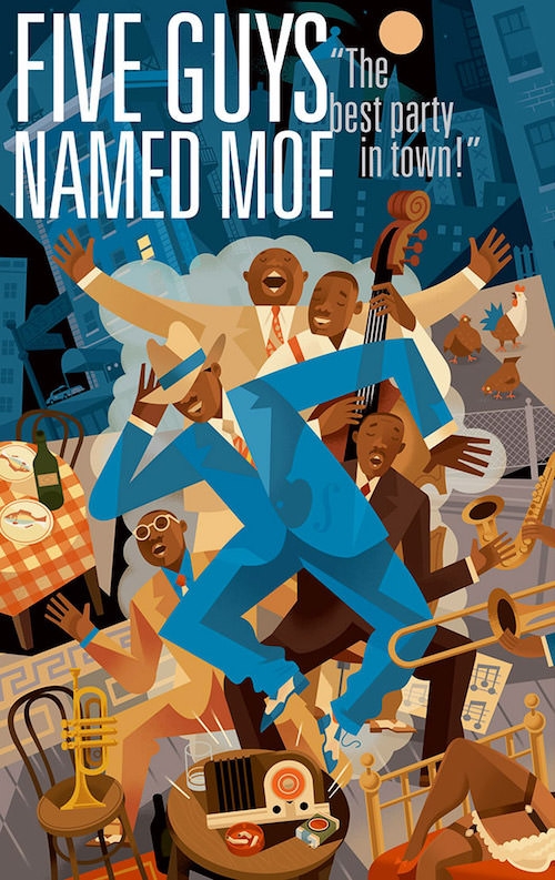 Poster for musical revue “Five Guys Named Moe” Arena Stage Washington DC. A very inspiring color palette being used here matched with elegant use of darker areas. This illustration is simply amazing. I can keep looking at it all day.