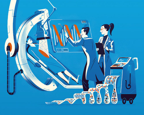 Editorial illustration for de Correspondent about the pharmaceutical industry and database marketing. Special how the face is almost 3D like.