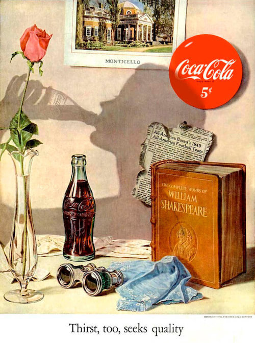 I love these vintage ads to study the textures, the transparency in the vase, the reflection etc. It’s all done with such photographical detail, and realistic perfection. The shadow silhouet is really cleverly done, especially the bottle is truly amazing. This one is an old Coca Cola ad from the USA (1950).