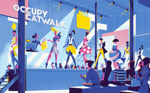 Editorial illustration for an article about the changing face of fashion. The thought that went into dresses on the models are really inspiring. What’s also very well done it how the yellow is applied. You would think a combination of yellow, lavender blue, and pink will never go well, but this proofs that it’s all about how the colors are applied. The highlight and shadow on the audience, and people on the catwalk is also very well done.