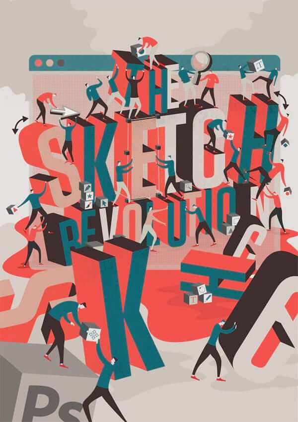 Editorial illustration for the cover of Net Magazine. The idea was originally to have a “revolution” of people scattered around the word “Sketch” since that now is considered cooler than Photoshop. I love the chaotic busy look here while it still feels like it’s all going smooth as an oiled machine.