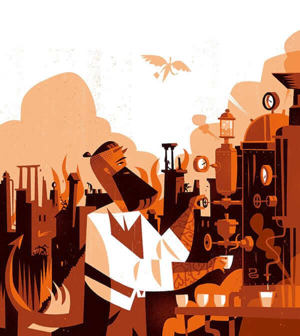 Fun illustration for an article on escaping the clutches of the hipster barista invasion. There are a few good details in it that are nicely hidden until you look closer.