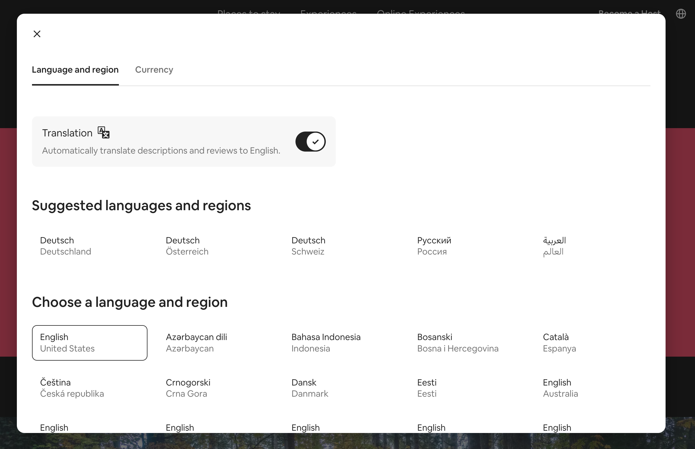 AirBnB suggests languages and regions in groups, but also allows users to adjust their preferences and choose a language and region of their choice. Additionally, users can opt-in to automatically translate descriptions and reviews to English. The modal is prompted by a tap on the globe icon in the right upper corner of the header.
