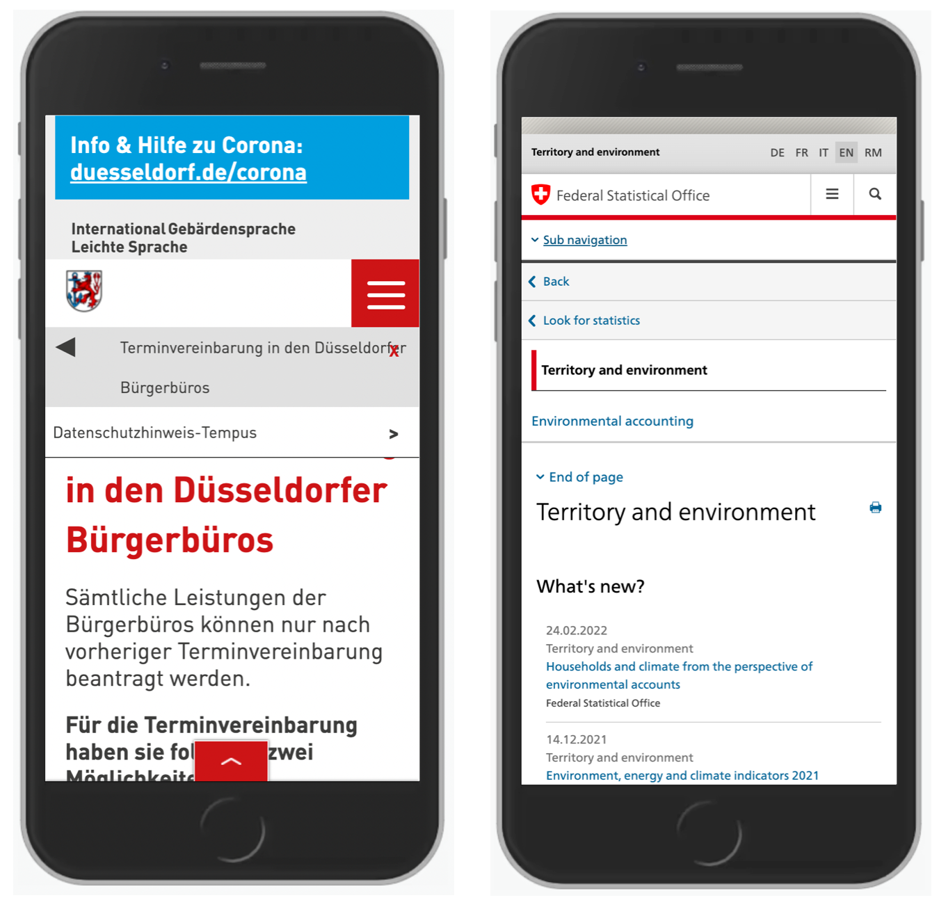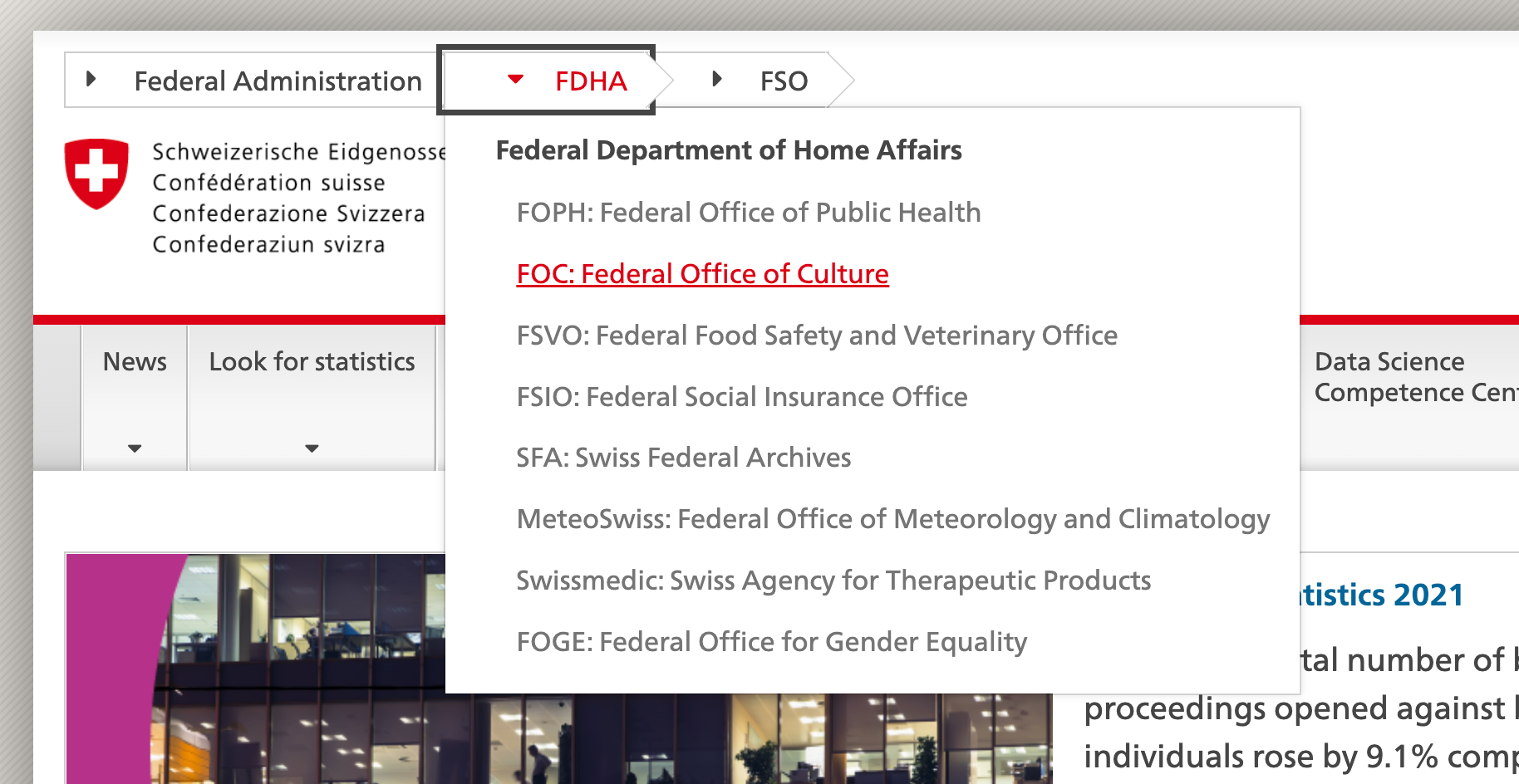 But of course, when we look into sideways breadcrumbs, we don’t have to use it only at the last level. Federal Administration of Statistics in Switzerland displays global sideways breadcrumbs that help users jump between different departments of the Federal Administration family of websites. The breadcrumbs are the first thing that users encounter on the site. Unfortunately, on mobile, breadcrumbs disappear entirely.