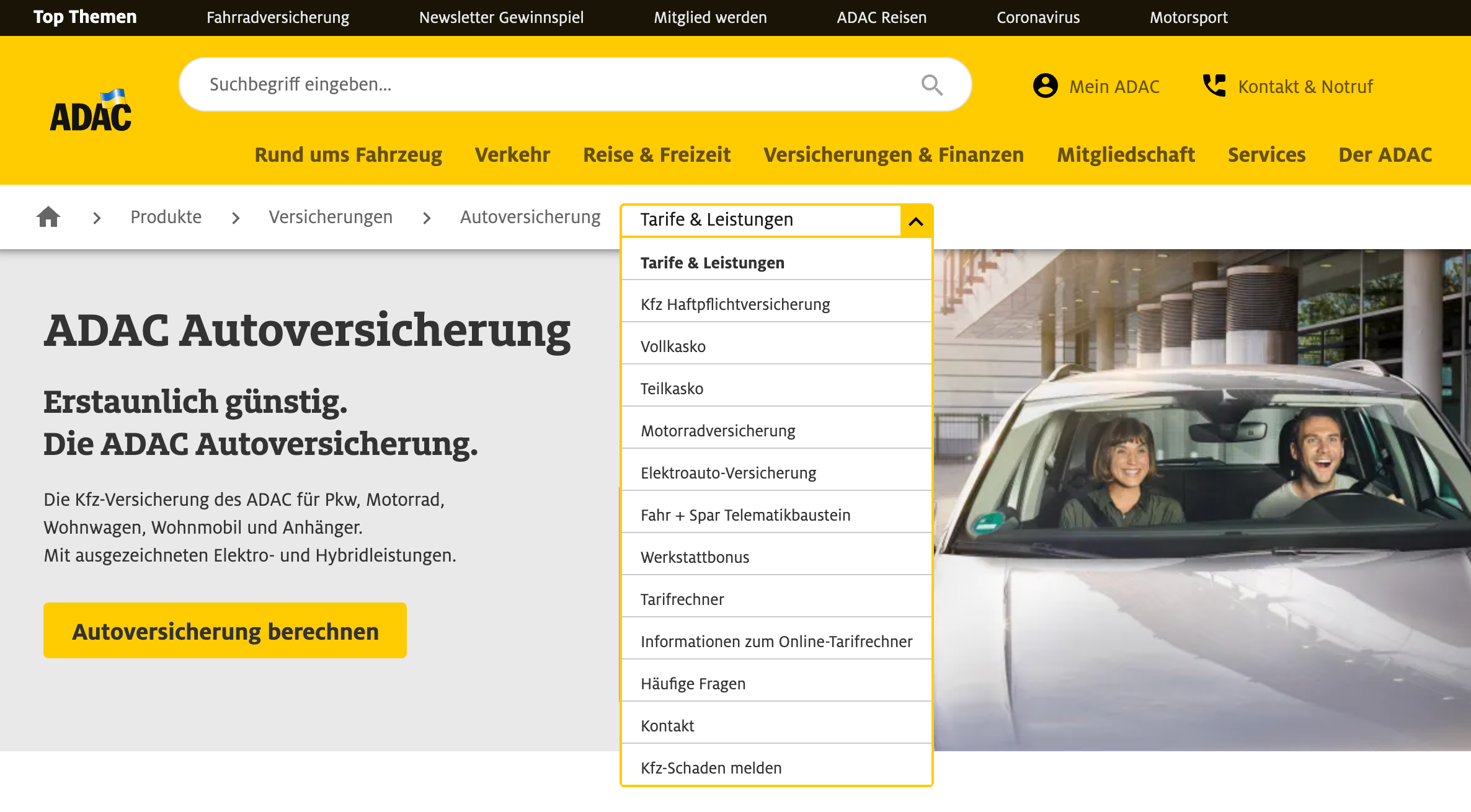 At ADAC example below, breadcrumbs are sort of extended — with a drop-down that allows users to jump to other sections within the category quickly. That’s the notion of sideways breadcrumbs which provide quick access to the siblings of the current page.