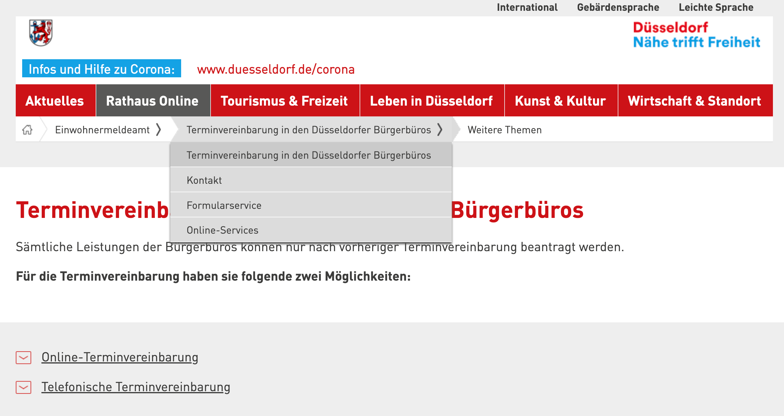 The City of Düsseldorf uses a similar pattern but rather than providing access to siblings of the current page, at first it seems to be providing quick jumps for siblings of the parent section. That’s not the case though. Surprisingly, the last item in the breadcrumb isn’t the current page but rather “other topics”, which also happens to be a drop-down. A bit surprising, but sideways breadcrumbs make their appearance here as well.