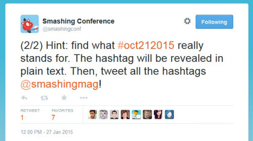 In the previous level, we saw a few people looking into connecting the dots between our previous and upcoming SmashingConf NYC, by tweeting out the hashtag #jun172014 which was the date of the very first SmashingConf in NYC last year. Well, that was indeed a good idea, and it was quite close, but unfortunately, it isn’t the right answer. Bret Sutherland somehow found Smashing NightConf happening in Llanfairpwllgwyngyll, which was also very close. Again, it doesn’t make sense to make assumptions about the hashtag since we are supposed to see it in plaintext.
