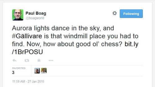 The reference to the next level was tweeted out with a few “correct” hashtags, i.e. #Gällivare, #Yrttivaara, #Abisko, #Umeå, #Kiruna and #Lapland. All of these were signs that somebody has been working hard to find the right answer. However, the first hashtags mentioned here had more “weight” than the others, so we’d prefer #Abisko over #Lapland, for example.