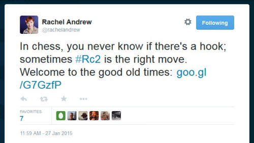 So what is the right move? Well, it could have been the famous Be6 (the move that made Fischer famous), but the constellation of figures isn’t right. So, it has to be the last move: rook going to c2. This means that the correct answer would be… #rookc2 or #rc2? Indeed, we accepted both hashtags. In fact, if we were sure that you were on the right track, e.g. with #centurygame, #gamecentury, #gameofthecentury, #fischervsbyrne or #byrnevsfischer, then you’d receive a point as well.
