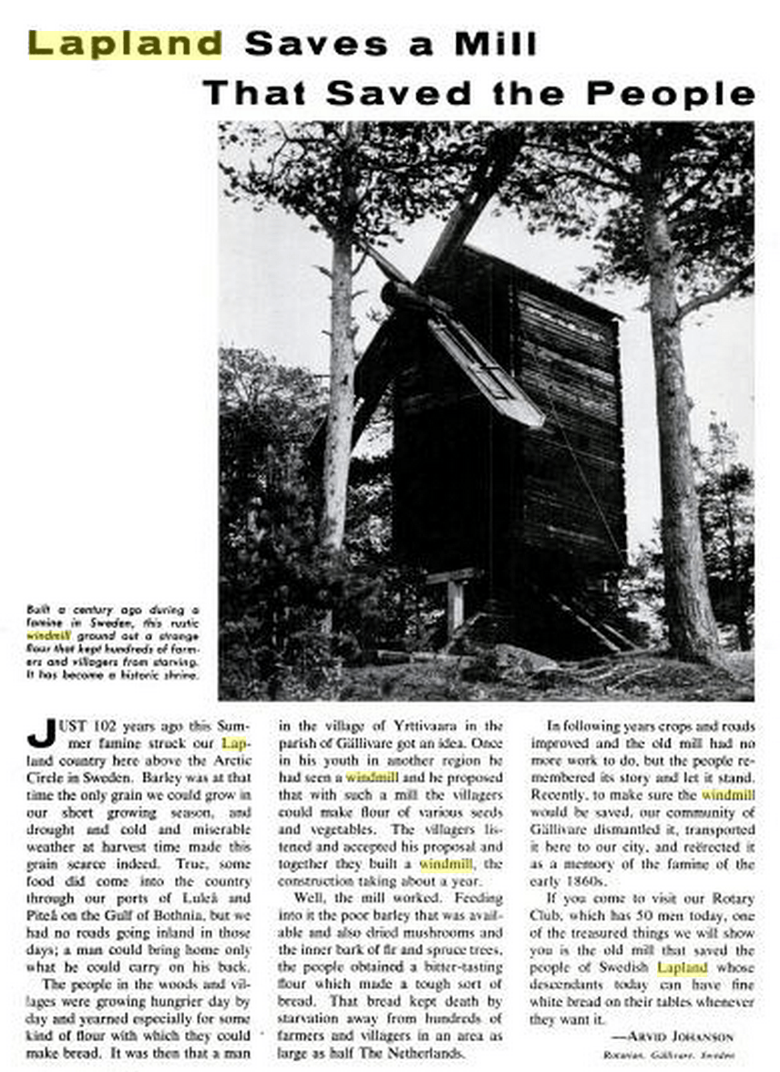 We end up at an obscure issue of “The Rotarian” magazine, or more specifically, an article titled “Lapland Saves a Mill That Saved The People”, written by Arvid Johanson and published in August 1963. If you read that article, you’ll find out that the construction of a rustic windmill was initiated by inhabitants of Yrttivaara, in Gällivare (Northern Sweden), in 1861. Built during a famine, that windmill ground out a strange flour that kept hundreds of farmers and villagers from starving. In fact, it has become a historic shrine.