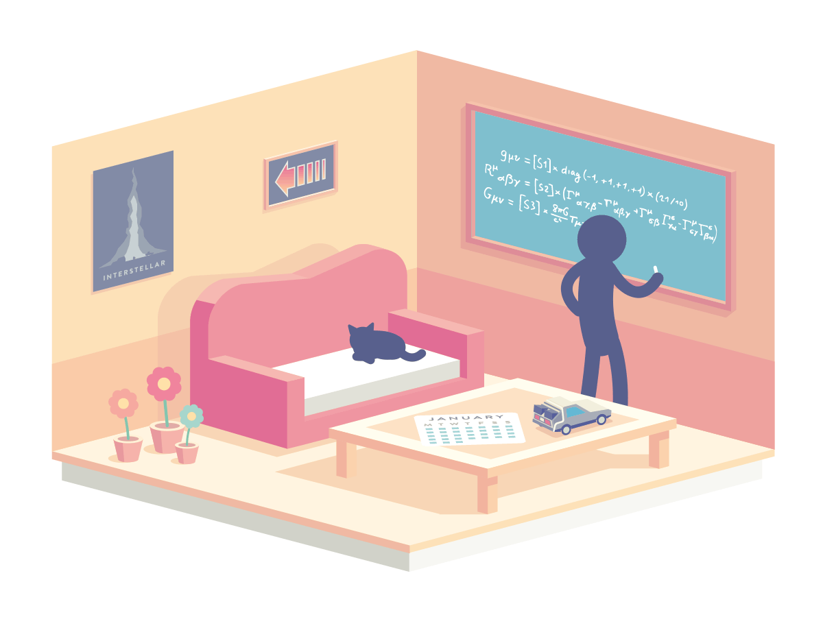 We see a math equation, and if somebody from your circles has studied physics, they will tell you that it’s Einstein’s field equations that describe gravitation as a result of spacetime being curved by matter and energy. The equations were postulated by Einstein, so what is our character trying to figure out here? Well, he obviously appears to be quite well equipped. Apart from a sleepy cat, we have a calendar on the table, the Interstellar poster on the wall (could it be related to wormholes?) as well as what appears to be a Back to the future movie sign and a good ol’ DeLorean DMC-12.