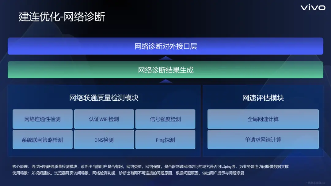 網絡診斷主要使用的場景是為視頻播放、瀏覽器網頁訪問提供網絡檢測功能;診斷出用户有網但是無法連接的問題原因;根據問題原因,做出用户提示與問題修復,提升 vivo 手機終端用户的使用體驗。