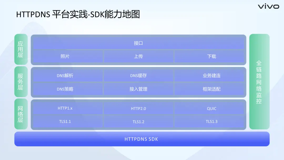 SDK 為我們承載 HTTPDNS 一體化解決方案的核心能力;在架構上主要提供底層網絡協議的支持,支持 HTTP1.X、HTTP2.0 和 QUIC 傳輸協議,同時也支持 TLS1.1、TLS1.2 和 TLS1.3 等加密協議;同時,在 TLS 協議的基礎上支持 Session Ticket 等優化策略;服務層提供 DNS 解析、DNS 緩存、業務建連、DNS 策略管控等功能;應用層提供接口、下載、上傳等能力;同時也提供全鏈路的網絡監控。