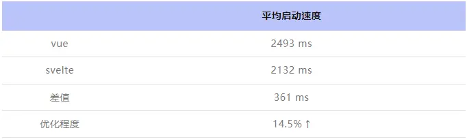 可以看到 Svelte 在線上的啓動速度表現也比 Vue 要快一些,優化程度約為14.5%。