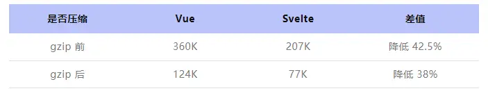 可以看到 Svelte 相比於 Vue,在包體大小上確實優化了不少,基本在40%左右,效果很明顯。